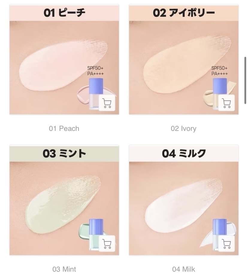 - 肌をケアしながらナチュラルにトーンアップをかなえる! ・コチニールサボテン果実エキス *1、10重層のヒアルロン酸 *2 配合で肌に水分感を与える ・しっとりしたテクスチャーで素肌にすっとなじみやすい ・肌悩みに合わせて、4つのカラーバリエーションから選べる( 01・02 は紫外線防止効果 ) ・自然なトーンアップ *3 ・塗り重ねるとナチュラルにトーンアップ*3して、肌のうるおい感もアップ <SPF 50+ PA++++/ 紫外線からの念入りなケアが必要な時にオススメ> 01 ピーチ 落ち着いた雰囲気のピーチカラー くすみをカバーして、血色感のある肌へ 02 アイボリー ほんのり色づくアイボリーカラー ナチュラルにトーン補正*3されたツヤ肌に <SPF, PA ZERO/ すっきりとしたトーンアップをしたい時にオススメ> 03 ミント 均一なトーンに補正*3するミントカラー 赤みをしっかりとカバーして、より華やかな肌に 04 ミルク 白浮きしにくいミルクカラー 乾燥でくすんだ部位も、ワントーン明るい肌印象*3へ *1 保湿成分 *2 ヒアルロン酸 Na、加水分解ムコ多糖、ヒアルロン酸ビドロキシプロビルトリモニウム、ヒアルロン酸クロスポリマー Na、加水分解ヒアルロン酸、アセチルヒアルロン酸 Na、ヒアルロン酸、加水分解ヒアルロン酸 Na、ヒアルロン酸 K:すべて保湿成分 *3 メイクアップ効果