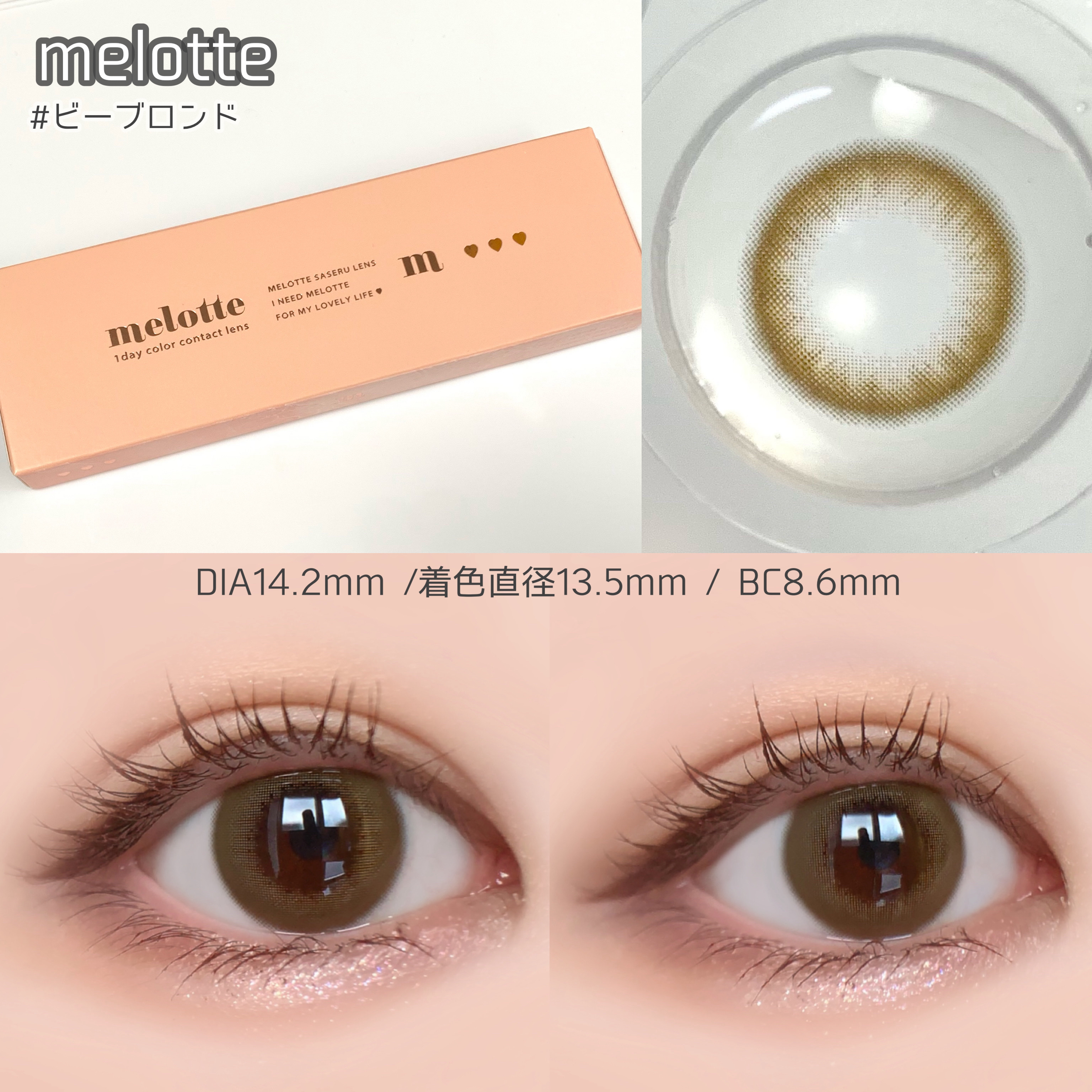 - 時には甘く、時にはオトナに。デザインだけでなく使いやすさにもこだわった、ナチュラルだけどしっかり可愛くなれるラインナップ。 一からこだわってつくった、いろんなメイクやファッションに合わせて楽しめるオトナ女子もつかいやすいナチュラルカラーのレンズデザインです。 毎日使うものだからこそ、レンズスペックまでこだわりました。 〇超薄型レンズ採用 0.06mmの超薄型レンズを採用。負担の少ない使い心地で、快適にお使いいただけます。 ※装用感には個人差があります。 〇日差しもケア UVカット機能 紫外線UV-Aを約50%、UV-Bを約95%、レンズに配合されたUV吸収材でカット。 ※目全体及び目の周辺を完全に覆っているわけではないのでUV防止用眼鏡・サングラスの代用にはなりません。 〇うるおい成分配合 うるおい成分、"MPCポリマー"がレンズをやさしく包み込むので、うるおい長持ち。 〇乾きにくい低含水レンズ 低含水レンズ素材は、水分蒸発量が少ないため、乾きにくいのが特徴。 カラーコンタクトレンズの不適正使用による眼障害の危険性等などがあります。 ●コンタクトレンズは高度管理医療機器です。不十分な洗浄・消毒など不適切なケアや、長時間・交換期間を超えた装用により、アレルギー性結膜炎、角膜感染症、角膜潰瘍等の重篤な眼障害が発生する危険性があります ●ご使用前に取扱説明書を確認してください 使用上の留意事項 ●眼科医院等を受診してからお求めください ●眼に異常を感じたら直ちにレンズ使用を中止し、お近くの眼科等で診察を受けてください ●医師の指示にしたがってご使用ください ●コンタクトレンズを装用する場合、自覚症状がなくても、眼科医院等での定期検査を受けてください ●レンズに不具合がある場合は使用しないでください