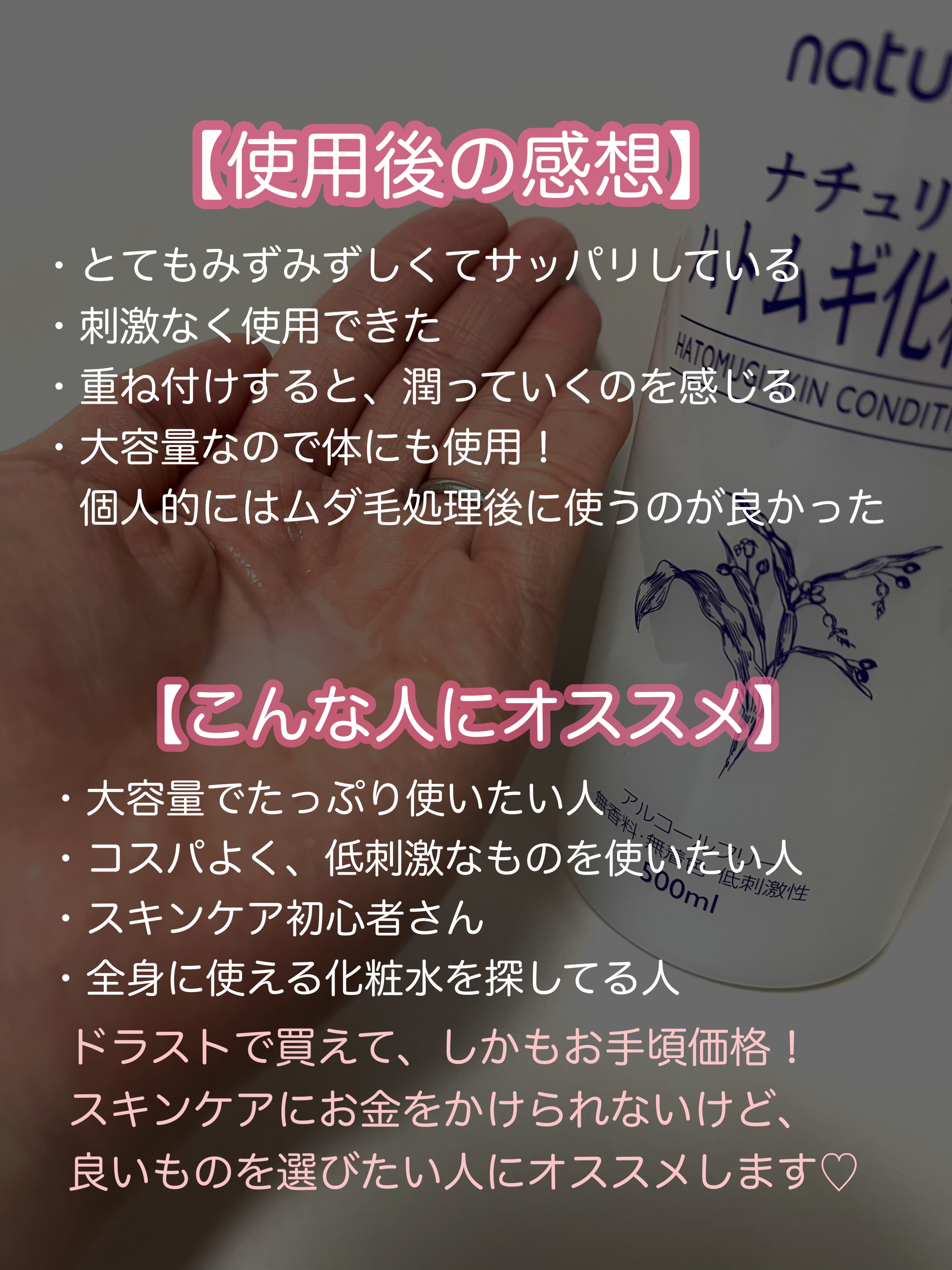 - 肌にうるおいを与えてスキンコンディションを整える、天然保湿成分ハトムギエキス配合の化粧水です。 みずみずしく浸透力に優れた処方なので、重ねるほどぐんぐん肌になじみ、角質層を水分で満たします。 たっぷり肌に重ねづけしてもべたつかないさっぱりした使用感なので、スキンケアのはじめにたっぷり使ってください。 肌がひんやりしてきたら十分に水分がなじんだサインです。 ■基本は化粧水として スキンケアのはじめにたっぷり使ってください。 500円玉大の量を3回重ねづけするのが目安です。 肌がひんやりしてきたら十分に水分がなじんだサインです。 ■ローションパックでさらにうるおい コットンやフェイスマスクにたっぷり含ませて約3分間パックすると、角質水分量がさらに高まります。 ■プレ化粧水として 洗顔後すぐにつけることで、その後につけるスキンケアのなじみをよくします。※角質層まで ■ボディにも べたつかないので、毎日の入浴後や日差しを浴びた後などのボディのスキンケアにもおすすめです。