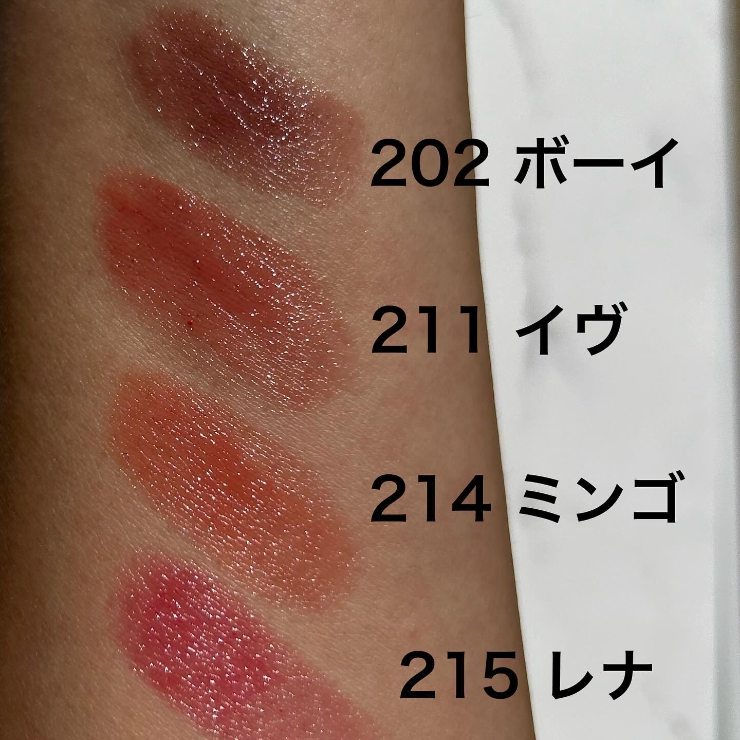 - <201 ミロ> ( アジピン酸/カプリン酸/カプリル酸/ヘプタン酸)ペンタエリスリチル、リンゴ酸ジイソステアリル、ダイマージリノール酸ダイマージリノレイルビス(ベヘニル/イソステアリル/フィトステリル)、オクチルドデカノール、合成ワックス、ポリイソブテン、トリメリト酸トリトリデシル、水添ポリイソブテン、トリイソステアリン酸ポリグリセリル-2、ジイソステアリン酸ダイマージリノレイル、マイクロクリスタリンワックス、セスキオレイン酸ソルビタン(小麦由来)、ポリヒドロキシステアリン酸、ジメチルシリル化シリカ、酢酸トコフェロール、パルミチン酸エチルヘキシル、レシチン、ミリスチン酸イソプロピル、イソステアリン酸、ジメチコン、ポリリシノレイン酸ポリグリセリル-3、デヒドロ酢酸、香料、(チタン/酸化チタン)焼結物、トコフェロール、酸化チタン、黄4、赤202、酸化鉄、橙201、紫201 <202 ボーイ> ( アジピン酸/カプリン酸/カプリル酸/ヘプタン酸)ペンタエリスリチル、リンゴ酸ジイソステアリル、ダイマージリノール酸ダイマージリノレイルビス(ベヘニル/イソステアリル/フィトステリル)、オクチルドデカノール、合成ワックス、ポリイソブテン、トリイソステアリン酸ポリグリセリル-2、トリメリト酸トリトリデシル、水添ポリイソブテン、マイクロクリスタリンワックス、ジイソステアリン酸ダイマージリノレイル、セスキオレイン酸ソルビタン(小麦由来)、ポリヒドロキシステアリン酸、ジメチルシリル化シリカ、酢酸トコフェロール、ミリスチン酸イソプロピル、イソステアリン酸、パルミチン酸エチルヘキシル、レシチン、ジメチコン、ポリリシノレイン酸ポリグリセリル-3、デヒドロ酢酸、硫酸Ba、香料、アラビアゴム、ウコン根エキス、マルトデキストリン、ロジン、トコフェロール、酸化チタン、黄4、赤201、酸化鉄、紫201、赤202、赤223 <203 マーク> ( アジピン酸/カプリン酸/カプリル酸/ヘプタン酸)ペンタエリスリチル、リンゴ酸ジイソステアリル、ダイマージリノール酸ダイマージリノレイルビス(ベヘニル/イソステアリル/フィトステリル)、オクチルドデカノール、合成ワックス、ポリイソブテン、トリメリト酸トリトリデシル、水添ポリイソブテン、トリイソステアリン酸ポリグリセリル-2、ジイソステアリン酸ダイマージリノレイル、マイクロクリスタリンワックス、セスキオレイン酸ソルビタン(小麦由来)、ポリヒドロキシステアリン酸、ジメチルシリル化シリカ、酢酸トコフェロール、硫酸Ba、パルミチン酸エチルヘキシル、レシチン、イソステアリン酸、ミリスチン酸イソプロピル、(チタン/酸化チタン)焼結物、ジメチコン、ポリリシノレイン酸ポリグリセリル-3、デヒドロ酢酸、香料、ロジン、アラビアゴム、ウコン根エキス、マルトデキストリン、トコフェロール、酸化チタン、黄4、酸化鉄、赤202、赤201、橙201、赤223 <204 ハヴ> ( アジピン酸/カプリン酸/カプリル酸/ヘプタン酸)ペンタエリスリチル、リンゴ酸ジイソステアリル、ダイマージリノール酸ダイマージリノレイルビス(ベヘニル/イソステアリル/フィトステリル)、オクチルドデカノール、合成ワックス、ポリイソブテン、トリイソステアリン酸ポリグリセリル-2、トリメリト酸トリトリデシル、水添ポリイソブテン、ジイソステアリン酸ダイマージリノレイル、マイクロクリスタリンワックス、セスキオレイン酸ソルビタン(小麦由来)、ポリヒドロキシステアリン酸、ジメチルシリル化シリカ、酢酸トコフェロール、ミリスチン酸イソプロピル、パルミチン酸エチルヘキシル、レシチン、イソステアリン酸、硫酸Ba、ジメチコン、(チタン/酸化チタン)焼結物、ポリリシノレイン酸ポリグリセリル-3、デヒドロ酢酸、香料、ロジン、トコフェロール、酸化チタン、黄4、酸化鉄、赤202、赤218 <205 マルド> ( アジピン酸/カプリン酸/カプリル酸/ヘプタン酸)ペンタエリスリチル、リンゴ酸ジイソステアリル、ダイマージリノール酸ダイマージリノレイルビス(ベヘニル/イソステアリル/フィトステリル)、オクチルドデカノール、合成ワックス、ポリイソブテン、トリメリト酸トリトリデシル、水添ポリイソブテン、トリイソステアリン酸ポリグリセリル-2、ジイソステアリン酸ダイマージリノレイル、マイクロクリスタリンワックス、セスキオレイン酸ソルビタン(小麦由来)、ポリヒドロキシステアリン酸、ジメチルシリル化シリカ、酢酸トコフェロール、パルミチン酸エチルヘキシル、イソステアリン酸、レシチン、ミリスチン酸イソプロピル、ジメチコン、ポリリシノレイン酸ポリグリセリル-3、デヒドロ酢酸、(チタン/酸化チタン)焼結物、香料、アラビアゴム、ウコン根エキス、マルトデキストリン、トコフェロール、酸化チタン、黄4、酸化鉄、赤202、赤201、橙201、赤223 <206 リリー> ( アジピン酸/カプリン酸/カプリル酸/ヘプタン酸)ペンタエリスリチル、リンゴ酸ジイソステアリル、ダイマージリノール酸ダイマージリノレイルビス(ベ