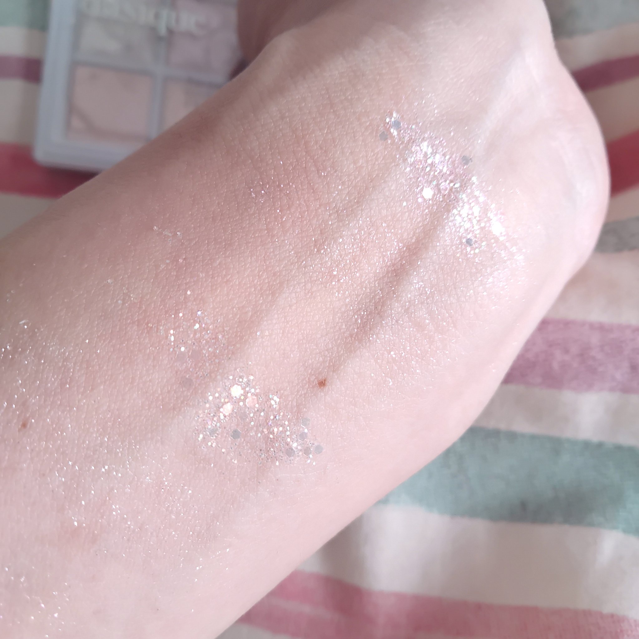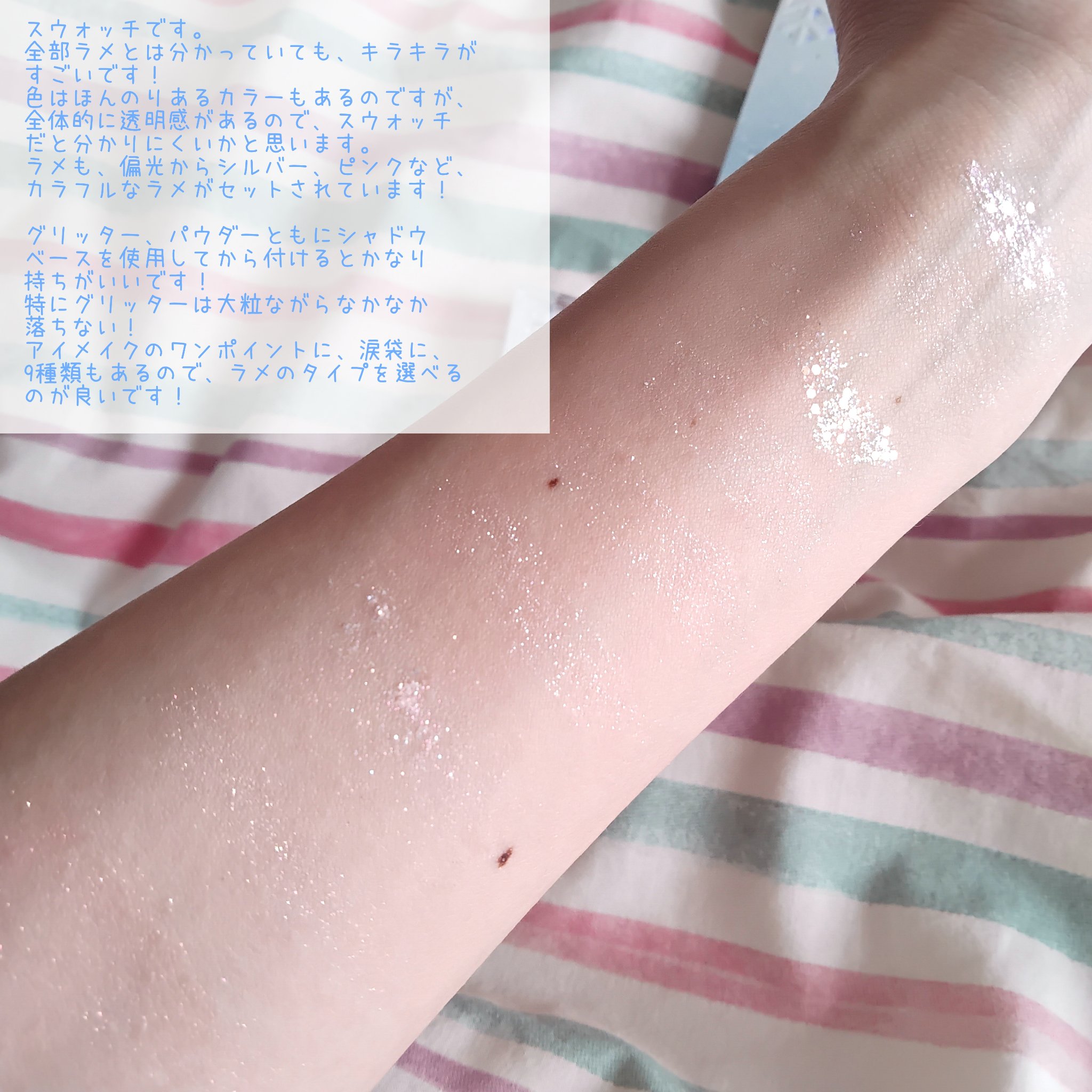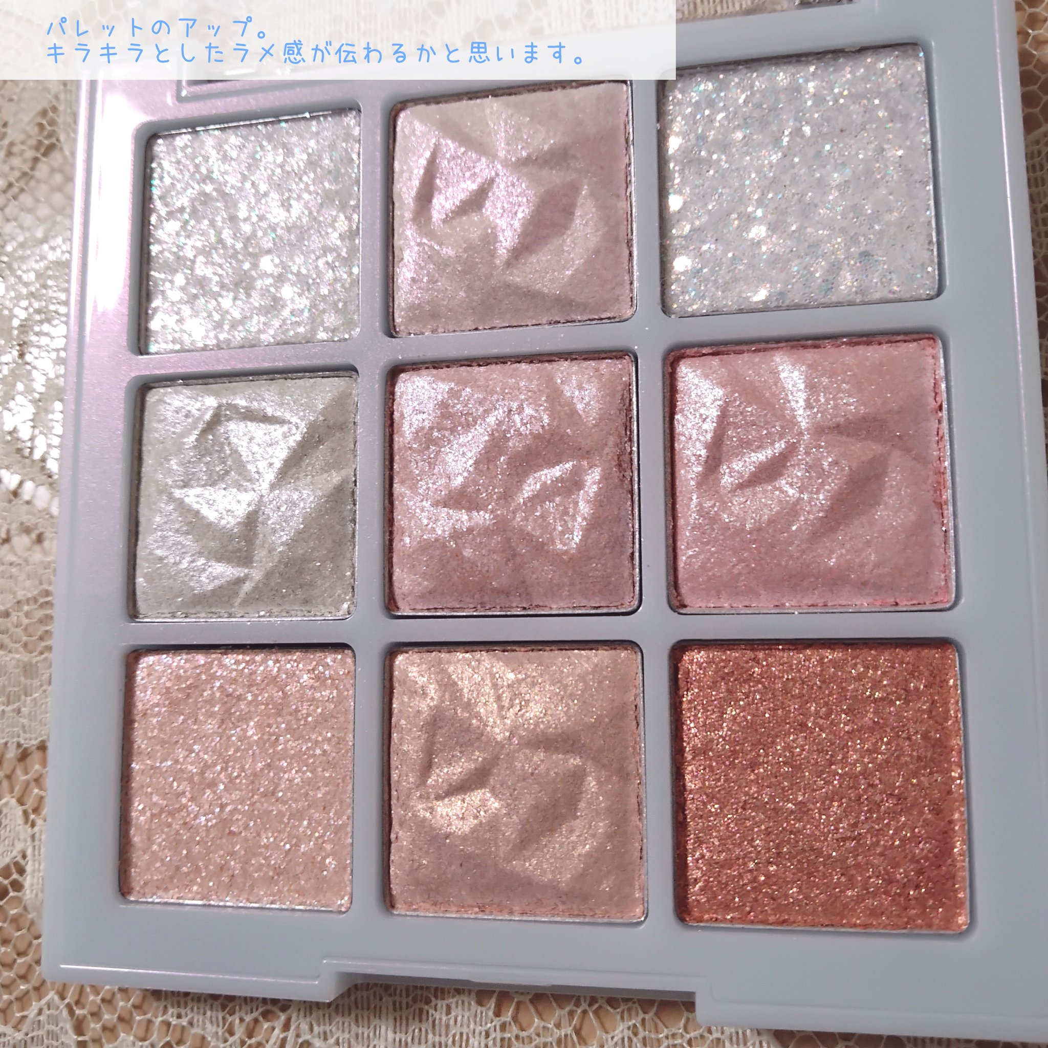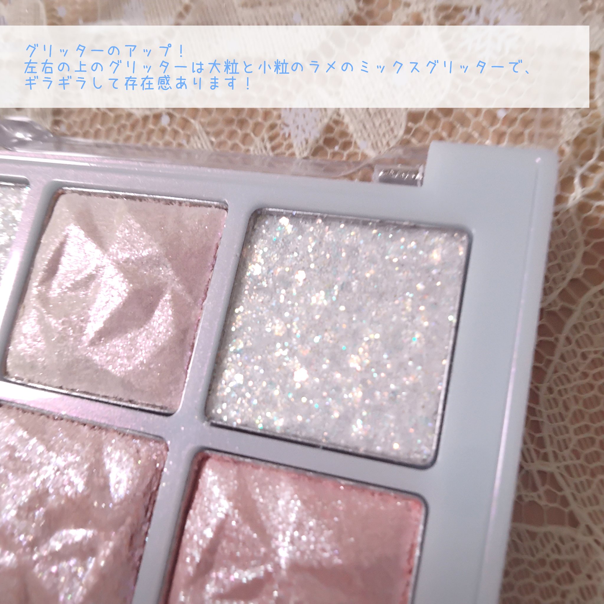こちらのパレットは全2種類で、店頭でも販売しています。 デザインはイラストを映えさせるために、ゴールドやオーロラで縁取られていたり、ぷっくり加工が施されていたり、とってもかわいいです! 細かい偏光ラメで黄緑色にキラキラ光ります。 左上の♡のカラーはパッと見パープルですが、実際塗って見るとカラフルなラメがぎっしり入っていて、目頭や涙袋にすごい使えると思います! ラメカラーはそれぞれタイプの違うラメが数種類入っているので、色々なメイクに挑戦できると思います。 今のところ01の左上のラメが好きです。粉質もしっとりしていて使いやすいです。 02は個性的なカラーが多いので、使いこなせれば万能ですが、使いやすいパレットが欲しい方は01をおすすめします。