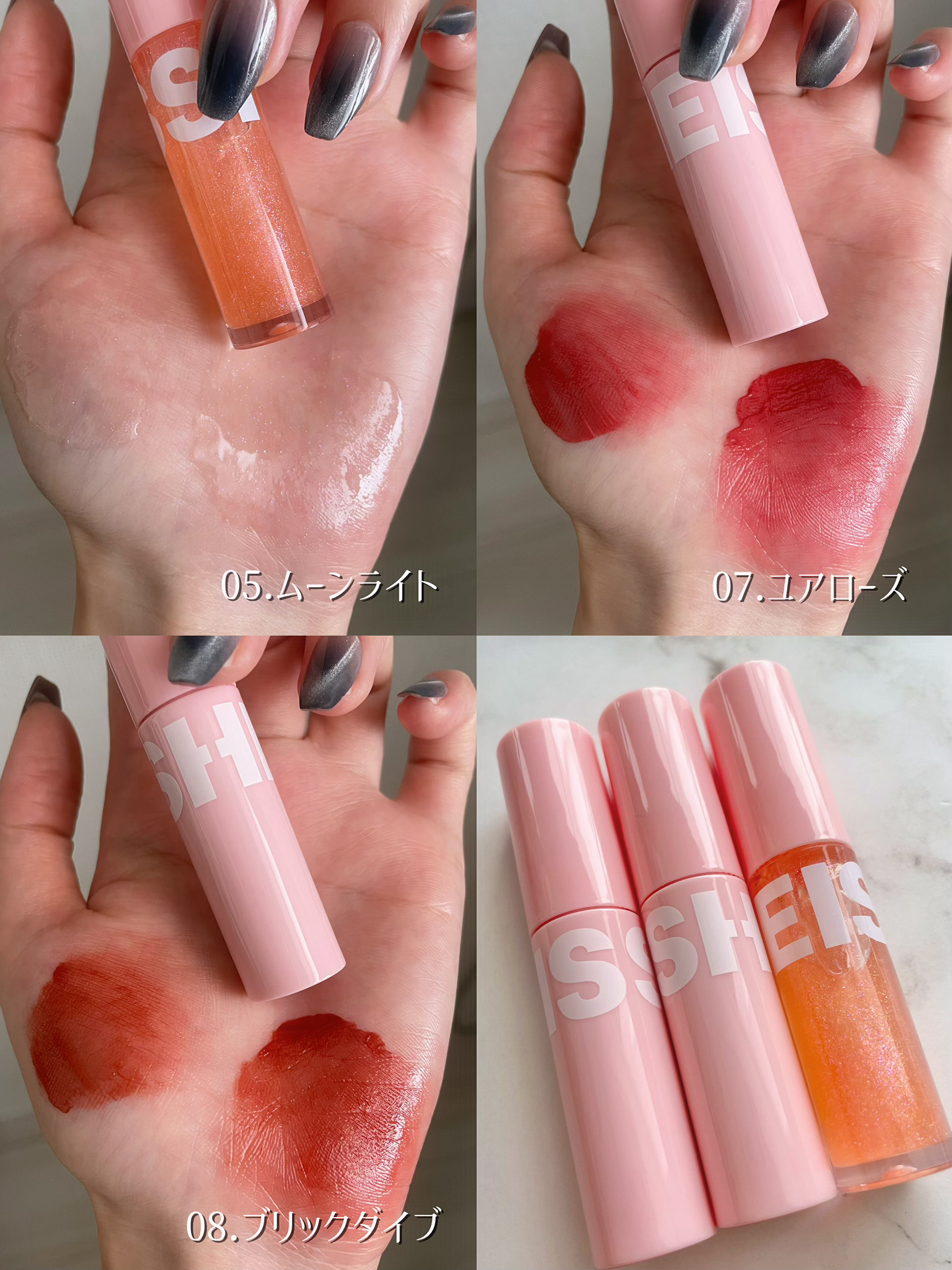 高屈折オイル配合!どの角度からでもツヤツヤに ぷるっぷるのつやつやリップになれるグロス🥺 02,06は色の系統がかなり似ているので、 深みが好きなら06 淡いカラーが好きなら02 で選ぶのがいいと思います꒰っ˙꒳˙c꒱♡