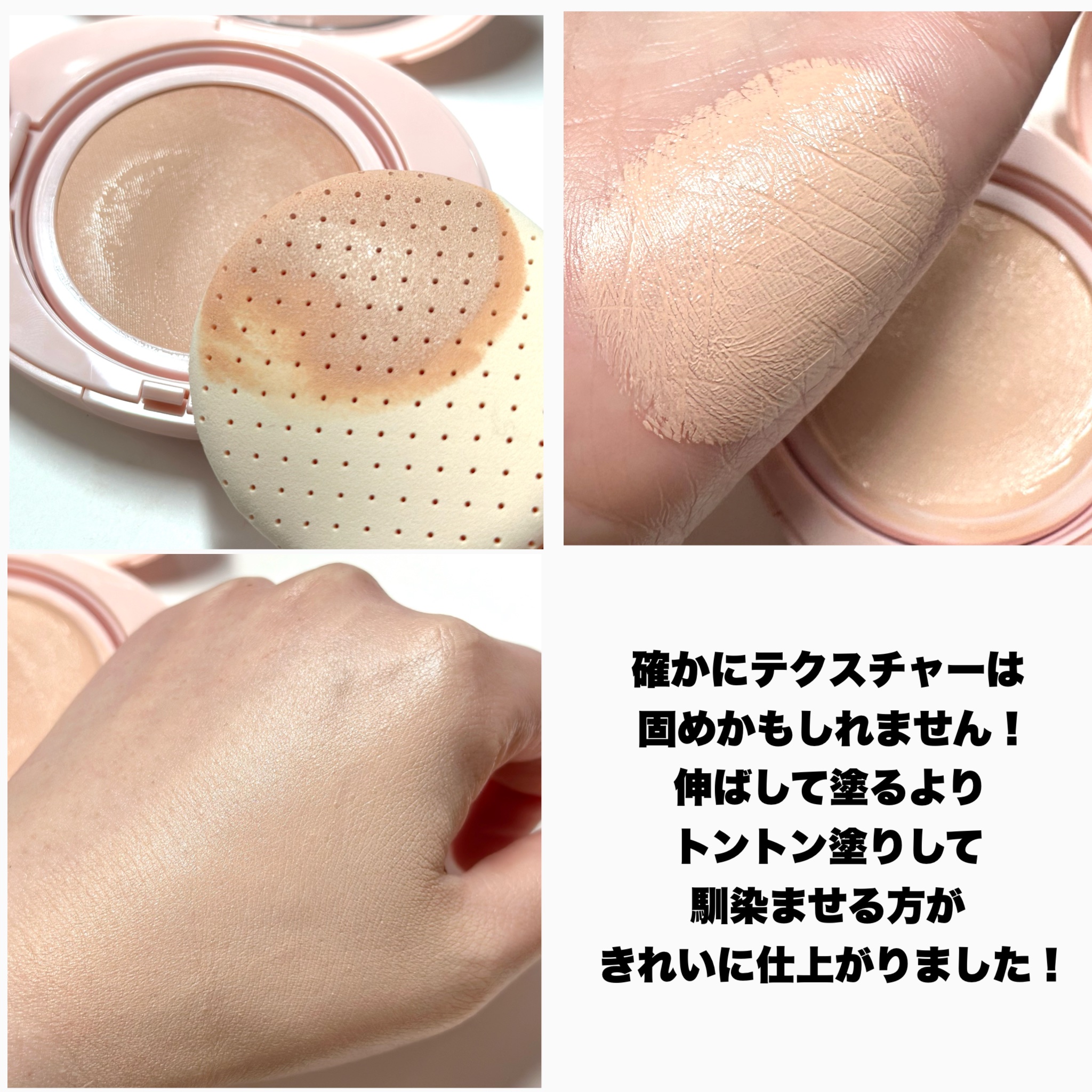 スキンケア成分配合で軽い付け心地だし サラッとした表面と中はしっとりもっちり墓室してくれてる感じ。 白玉肌が長時間続くとあったけど 高温多湿の日は正直とんでもなく崩れた😂 どちらかというと秋冬向けなクッションの印象!!