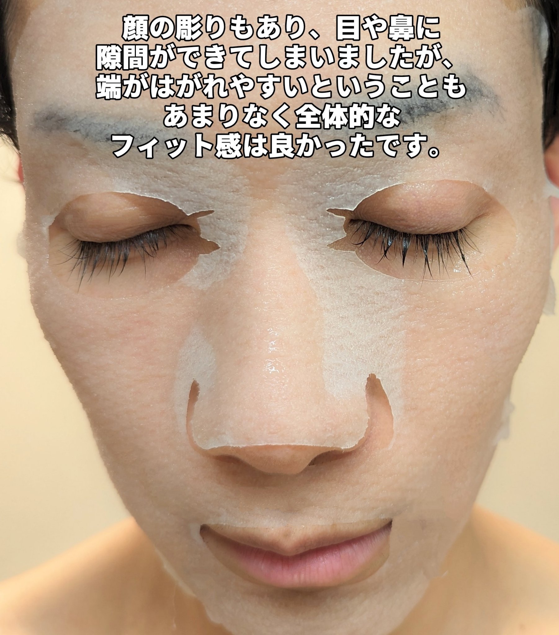 手軽な貼る化粧水 化粧水代わりに使えるデイリーマスクで、美容液マスクほどもったりしたような感じではありませんでした。 密着感&伸縮性◯ マスクは密着感と伸縮性もあるので、特にいつも気になるところだった、こめかみやあご周りの剥がれもなく、しっかり覆ってくれました! リーズナブルで続けやすい価格 7枚440円(1枚あたり約63円)とリーズナブルで毎日使いやすく、小容量なので衛生面的にも良いと思いました。