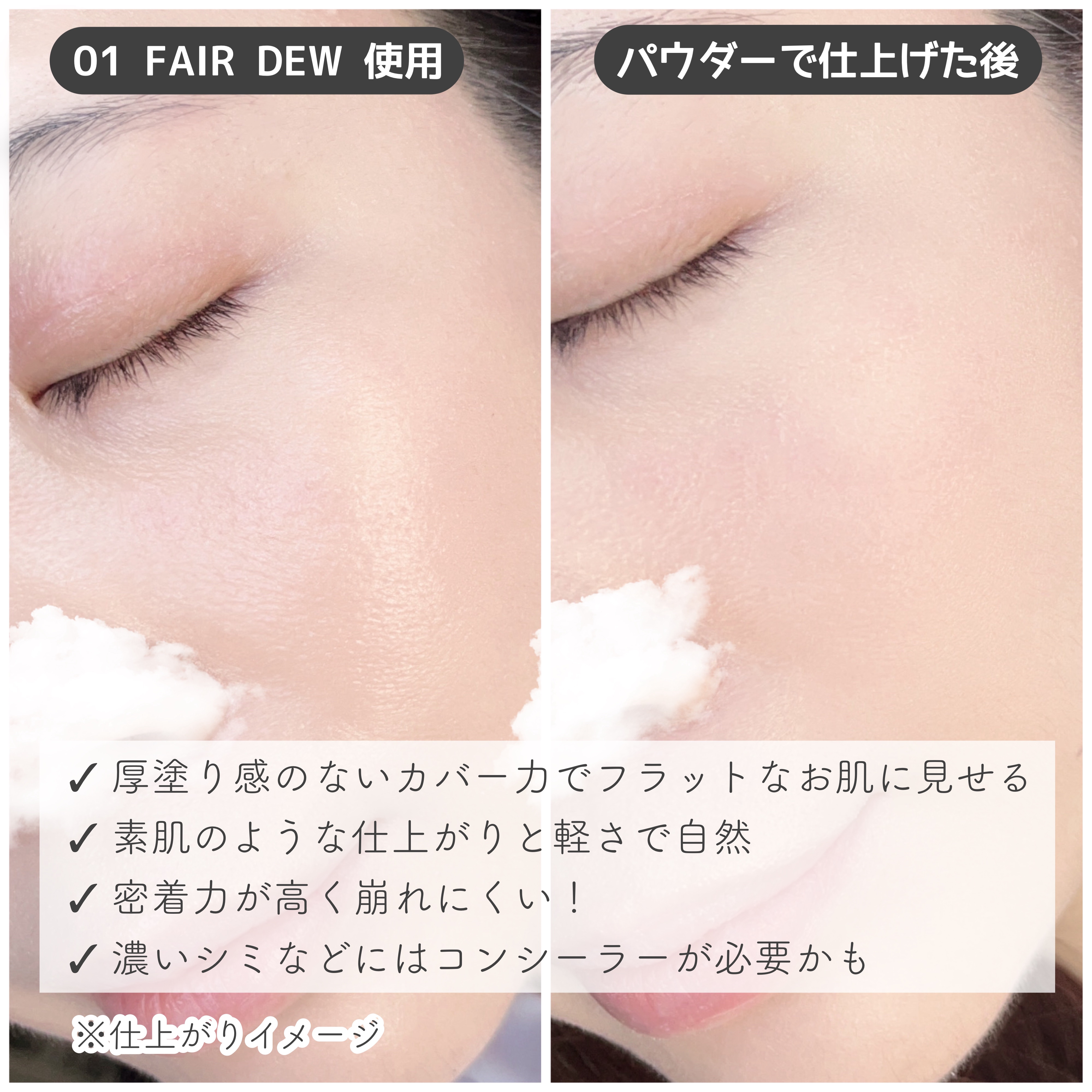 ゆるめでみずみずしい感じ。するするーっとなめらかに伸びて、少量で全顔いけます◎ しっとり感のある素肌っぽい仕上がり!ややツヤ寄りのセミマットで、自然なツヤ感で立体感のある顔に🫶🏻 色ムラ・毛穴もしっかり補正してくれる! 薄膜で綺麗なタイプなので、崩れ方もとっても綺麗!時間経過によるくすみも感じませんでした✨️ 最初のしっとり感も残ったままで、落としてもお肌がしっとりしていて、乾燥肌にはかなり嬉しい処方でした🥰