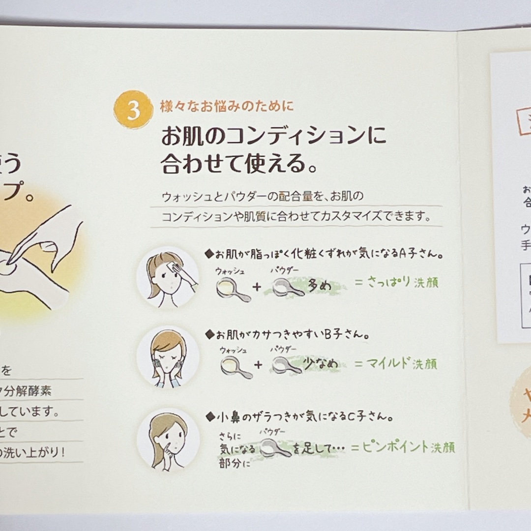 - リキッドタイプのウォッシュとパウダーを混ぜて使用する、泡の立たないマイルドな洗顔料。つっぱり感が少なく、すべすべでなめらかな洗い上がりです。肌に優しい使い心地で、古い角質や汚れを穏やかに取り除きます。小鼻の周りなど、ザラつきが気になる部分には顔全体にウォッシュ&パウダーを伸ばした後、さらにパウダーで洗うと、すべすべ肌に。必要なうるおいを残しながら毛穴に詰まった汚れまでしっかりと落とします。 ■ウォッシュ/無着色・無鉱物油・オイルフリー ■パウダー/無香料・無着色・無鉱物油