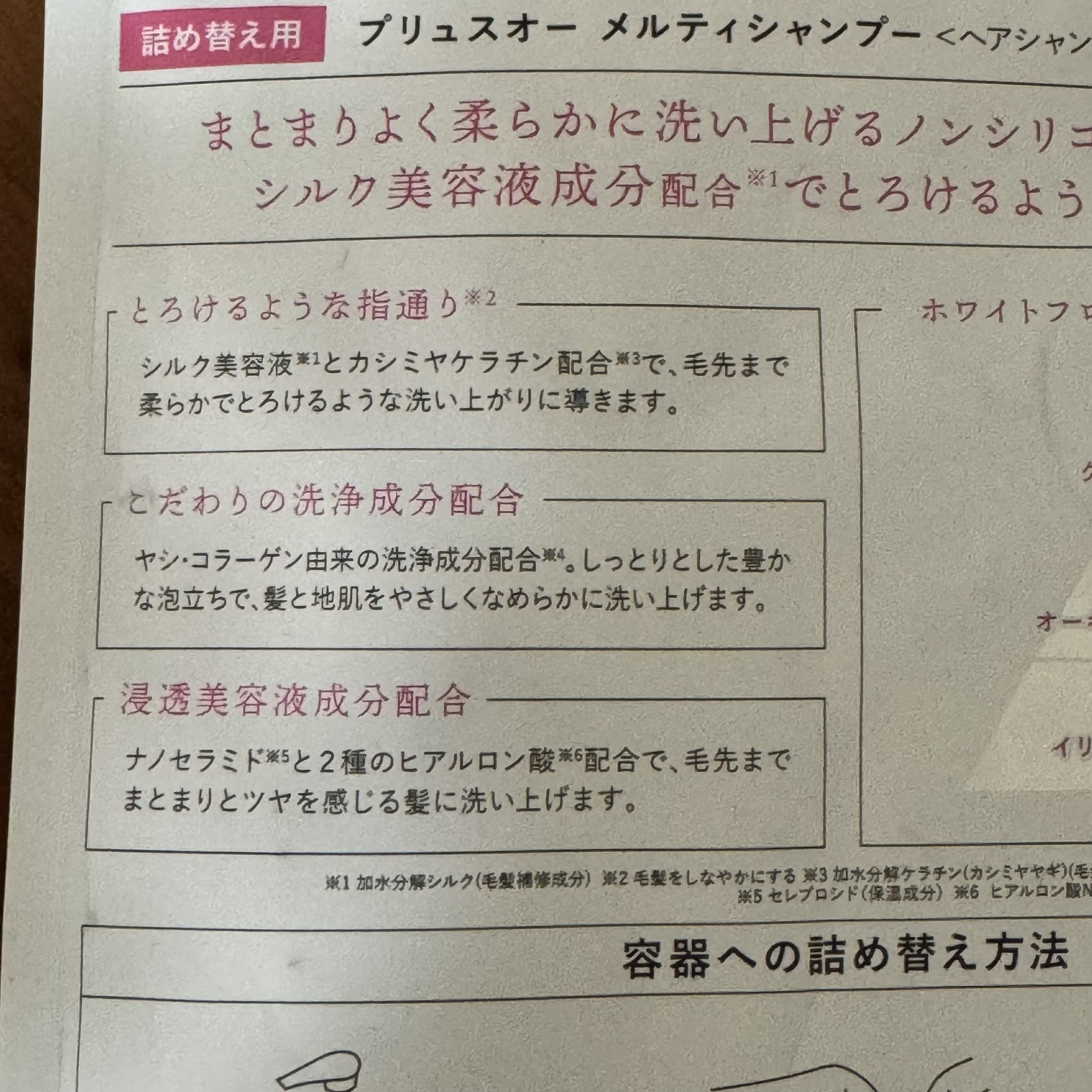 - <メルティシャンプー> 水、グリセリン、コカミドプロピルベタイン、ラウラミドDEA、ココイルメチルタウリンNa、コカミドDEA、ラウロイルメチルアラニンNa、ココイル加水分解コラーゲンK、ココイル加水分解ケラチンK、ココイルグリシンNa、加水分解ケラチン(カシミヤヤギ)、加水分解ケラチン(羊毛)、加水分解シルク、セレブロシド、セラミドNP、ヘマチン、メドウフォーム-δ-ラクトン、セラミドEOP、セラミドAP、ツボクサエキス、ジラウロイルグルタミン酸リシンNa、オプンティアストレプタカンサエキス、異性化糖、アルガニアスピノサ核油、ヒアルロン酸Na、ヒアルロン酸ヒドロキシプロピルトリモニウム、EDTA-3Na、加水分解ダイズタンパク、加水分解ローヤルゼリータンパク、ポリクオタニウム-10、ポリクオタニウム-7、アボカド油、バオバブ種子油、ポリクオタニウム-52、ヒマワリ種子油、ホホバ種子油、ヤシ油アルキルグルコシド、プロポリスエキス、シャクヤク根エキス、オタネニンジン根エキス、カミツレ花エキス、ハチミツ、ハチミツエキス、ローヤルゼリー、BG、ラウロイルラクチレートNa、ヤシ油脂肪酸PEG-7グリセリル、ジステアリン酸PEG-150、グリチルリチン酸2K、ラウロイルグルタミン酸ジ(フィトステリル/オクチルドデシル)、PEG-32、PEG-1ラウリルグリコール、トコフェロール、フィトスフィンゴシン、キサンタンガム、カルボマー、エチドロン酸、コレステロール、エチドロン酸4Na、クエン酸、メチルパラベン、エタノール、フェノキシエタノール、香料 <メルティトリートメント> 水、グリセリン、ステアリルアルコール、ベヘントリモニウムクロリド、ジメチコン、加水分解シルク、加水分解ケラチン(カシミヤヤギ)、加水分解ケラチン(羊毛)、加水分解ケラチン、セレブロシド、セラミドNP、ヘマチン、メドウフォーム-δ-ラクトン、セラミドEOP、セラミドAP、ツバキ種子油、ホホバ種子油、アボカド油、バオバブ種子油、ヒマワリ種子油、乳酸桿菌/豆乳発酵液、プルケネチアボルビリス種子油、加水分解コラーゲン、水溶性コラーゲン、サクシノイルアテロコラーゲン、アルガニアスピノサ核油、ポリクオタニウム-51、ポリクオタニウム-64、加水分解ローヤルゼリータンパク、ヒアルロン酸Na、ヒアルロン酸ヒドロキシプロピルトリモニウム、ジラウロイルグルタミン酸リシンNa、ラウロイルグルタミン酸ジ(フィトステリル/オクチルドデシル)、ポリクオタニウム-11、メドウフォーム油、ヨモギ葉エキス、モモ葉エキス、アマモエキス、レモン果実エキス、グレープフルーツ果皮油、ゴボウ根エキス、コーヒー種子エキス、オプンティアストレプタカンサエキス、ミツイシコンブエキス、グレープフルーツ果実エキス、ゴマ油、シア脂、加水分解ダイズタンパク、黒砂糖、BG、ステアリン酸PEG-55、シクロペンタシロキサン、アルギニン、グルタミン酸、ステアルトリモニウムクロリド、グリチルリチン酸2K、グルコシルルチン、PPG-3カプリリルエーテル、ラウロイルラクチレートNa、ペンチレングリコール、ユビキノン、水添レシチン、トコフェロール、フィトスフィンゴシン、コレステロール、キサンタンガム、カルボマー、腐植土抽出物、イソプロパノール、ヒドロキシエチルセルロース、ジココジモニウムクロリド、フェノキシエタノール、アモジメチコン、アミノプロピルジメチコン、エタノール、香料 <メルティシャンプー詰替> 水、グリセリン、コカミドプロピルベタイン、ラウラミドDEA、ココイルメチルタウリンNa、コカミドDEA、ラウロイルメチルアラニンNa、ココイル加水分解コラーゲンK、ココイル加水分解ケラチンK、ココイルグリシンNa、加水分解ケラチン(カシミヤヤギ)、加水分解ケラチン(羊毛)、加水分解シルク、セレブロシド、セラミドNP、ヘマチン、メドウフォーム-δ-ラクトン、セラミドEOP、セラミドAP、ツボクサエキス、ジラウロイルグルタミン酸リシンNa、オプンティアストレプタカンサエキス、異性化糖、アルガニアスピノサ核油、ヒアルロン酸Na、ヒアルロン酸ヒドロキシプロピルトリモニウム、EDTA-3Na、加水分解ダイズタンパク、加水分解ローヤルゼリータンパク、ポリクオタニウム-10、ポリクオタニウム-7、アボカド油、バオバブ種子油、ポリクオタニウム-52、ヒマワリ種子油、ホホバ種子油、ヤシ油アルキルグルコシド、プロポリスエキス、シャクヤク根エキス、オタネニンジン根エキス、カミツレ花エキス、ハチミツ、ハチミツエキス、ローヤルゼリー、BG、ラウロイルラクチレートNa、ヤシ油脂肪酸PEG-7グリセリル、ジステアリン酸PEG-150、グリチルリチン酸2K、ラウロイルグルタミン酸ジ(フィトステリル/オクチルドデシル)、PEG-32、PEG-1ラウリルグリコール、トコフェロール、フィトスフィンゴシン、キサンタンガム、カルボマー、エチドロン酸、コレステロール、エチドロン酸4Na、クエン酸、メチルパラベン、エタノール、フェノキシエタノール、香料 <メルティトリートメント詰