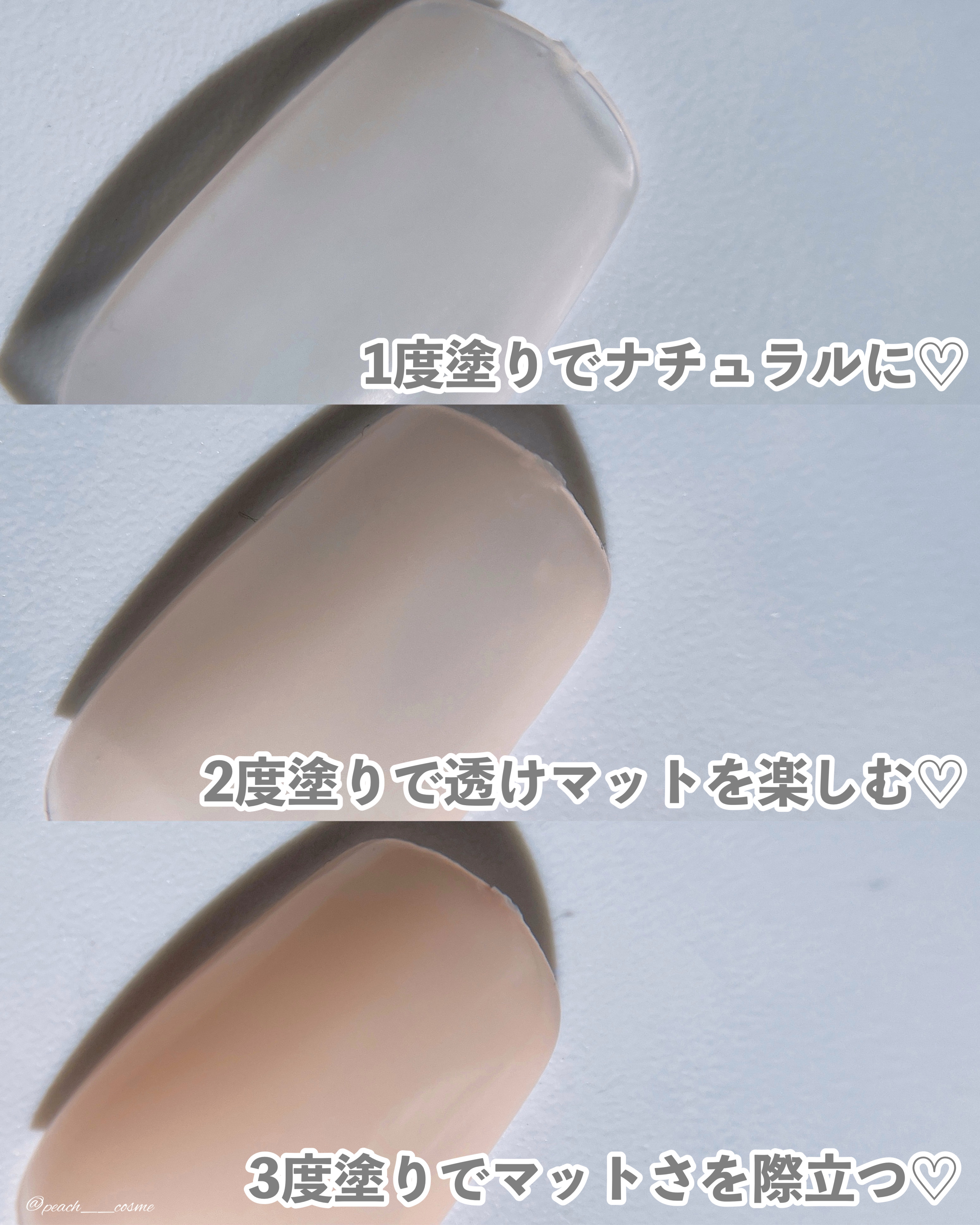 - "モチの良さ"にこだわった処方で、ベースコート無しでもしっかりと爪に密着し、 塗りたての美しさが長く続きます。なめらかな塗り心地で、ムラなく美しく塗れるテクスチャ。