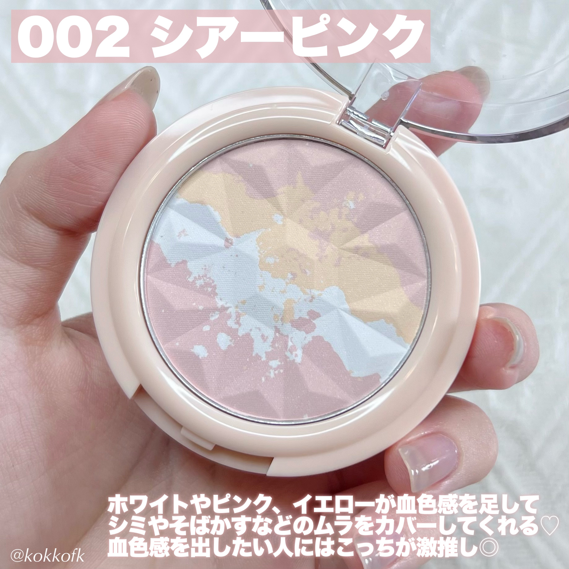 - <001 シアー パステル> マイカ、ポリメタクリル酸メチル、シリカ、メトキシケイヒ酸エチルヘキシル、ナイロン-12、ポリメチルシルセスキオキサン、窒化ホウ素、(ジフェニルジメチコン/ビニルジフェニルジメチコン/シルセスキオキサン)クロスポリマー、合成フルオロフロゴパイト、トリ(カプリル酸/カプリン酸)グリセリル、ケイ酸(Al/Ca/Na)、リンゴ酸ジイソステアリル、合成ワックス、アロエベラ葉エキス、セロリ種子エキス、カプリリルグリコール、ジメチコン、エチルヘキシルグリセリン、カオリン、ラウロイルリシン、アマ種子エキス、メチコン、トリオレイン酸ソルビタン、スクワラン、酸化スズ、トコフェロール、トリエトキシカプリリルシラン、デヒドロ酢酸Na[+/-]酸化亜鉛、水酸化クロム、酸化鉄、酸化チタン、グンジョウ <002 シアー ピーチ> マイカ、ポリメタクリル酸メチル、シリカ、メトキシケイヒ酸エチルヘキシル、ナイロン-12、ポリメチルシルセスキオキサン、窒化ホウ素、(ジフェニルジメチコン/ビニルジフェニルジメチコン/シルセスキオキサン)クロスポリマー、合成フルオロフロゴパイト、トリ(カプリル酸/カプリン酸)グリセリル、ケイ酸(Al/Ca/Na)、リンゴ酸ジイソステアリル、合成ワックス、アロエベラ葉エキス、セロリ種子エキス、カプリリルグリコール、ジメチコン、エチルヘキシルグリセリン、カオリン、ラウロイルリシン、アマ種子エキス、メチコン、トリオレイン酸ソルビタン、スクワラン、酸化スズ、トコフェロール、トリエトキシカプリリルシラン、デヒドロ酢酸Na[+/-]酸化亜鉛、水酸化クロム、酸化鉄、酸化チタン、グンジョウ