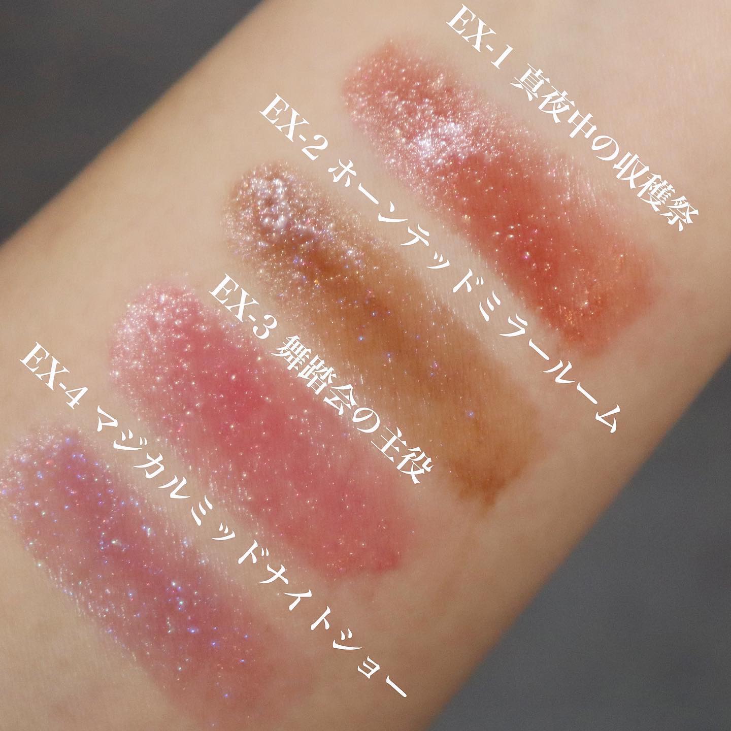 - <01 欲望の塊> テトライソステアリン酸ジペンタエリスリチル、トリ(カプリル酸/カプリン酸)グリセリル、オクチルドデカノール、ラウロイルグルタミン酸ジ(フィトステリル/オクチルドデシル)、ビスアルキル(C16-18)グリセリルウンデシルジメチコン、イソノナン酸イソトリデシル、水添ポリイソブテン、ラウロイルグルタミン酸ジ(オクチルドデシル/フィトステリル/ベヘニル)、パラフィン、合成ワックス、ダイマージリノール酸(フィトステリル/イソステアリル/セチル/ステアリル/ベヘニル)、マイクロクリスタリンワックス、水添マイクロクリスタリンワックス、ヒドロキシステアリン酸エチルヘキシル、トコフェロール、ホホバ種子油、オリーブ果実油、アーモンド油、(エチレン/プロピレン)コポリマー、ポリエチレン、ジメチコン、(+/-)(チタン/酸化チタン)焼結物、マイカ、ラウロイルアスパラギン酸Na、ラウロイルリシン、塩化亜鉛、酸化チタン、酸化鉄、水酸化Al、硫酸Ba、トリイソステアリン酸イソプロピルチタン、酸化スズ、ホウケイ酸(Ca/Al)、合成フルオロフロゴパイト、黄4、黄5、赤104(1)、赤201、赤202 <02 ピンクバナナ> テトライソステアリン酸ジペンタエリスリチル、トリ(カプリル酸/カプリン酸)グリセリル、オクチルドデカノール、ラウロイルグルタミン酸ジ(フィトステリル/オクチルドデシル)、ビスアルキル(C16-18)グリセリルウンデシルジメチコン、イソノナン酸イソトリデシル、水添ポリイソブテン、ラウロイルグルタミン酸ジ(オクチルドデシル/フィトステリル/ベヘニル)、パラフィン、合成ワックス、ダイマージリノール酸(フィトステリル/イソステアリル/セチル/ステアリル/ベヘニル)、マイクロクリスタリンワックス、水添マイクロクリスタリンワックス、ヒドロキシステアリン酸エチルヘキシル、トコフェロール、ホホバ種子油、オリーブ果実油、アーモンド油、(エチレン/プロピレン)コポリマー、ポリエチレン、ジメチコン、(+/-)(チタン/酸化チタン)焼結物、マイカ、ラウロイルアスパラギン酸Na、ラウロイルリシン、塩化亜鉛、酸化チタン、酸化鉄、水酸化Al、硫酸Ba、トリイソステアリン酸イソプロピルチタン、酸化スズ、ホウケイ酸(Ca/Al)、合成フルオロフロゴパイト、黄4、黄5、赤104(1)、赤201、赤202 <03 陽炎> テトライソステアリン酸ジペンタエリスリチル、トリ(カプリル酸/カプリン酸)グリセリル、オクチルドデカノール、ラウロイルグルタミン酸ジ(フィトステリル/オクチルドデシル)、ビスアルキル(C16-18)グリセリルウンデシルジメチコン、イソノナン酸イソトリデシル、水添ポリイソブテン、ラウロイルグルタミン酸ジ(オクチルドデシル/フィトステリル/ベヘニル)、パラフィン、合成ワックス、ダイマージリノール酸(フィトステリル/イソステアリル/セチル/ステアリル/ベヘニル)、マイクロクリスタリンワックス、水添マイクロクリスタリンワックス、ヒドロキシステアリン酸エチルヘキシル、トコフェロール、ホホバ種子油、オリーブ果実油、アーモンド油、(エチレン/プロピレン)コポリマー、ポリエチレン、ジメチコン、(+/-)(チタン/酸化チタン)焼結物、マイカ、ラウロイルアスパラギン酸Na、ラウロイルリシン、塩化亜鉛、酸化チタン、酸化鉄、水酸化Al、硫酸Ba、トリイソステアリン酸イソプロピルチタン、酸化スズ、ホウケイ酸(Ca/Al)、合成フルオロフロゴパイト、黄4、黄5、赤104(1)、赤201、赤202 <04 パンプキンワイン> テトライソステアリン酸ジペンタエリスリチル、トリ(カプリル酸/カプリン酸)グリセリル、オクチルドデカノール、ラウロイルグルタミン酸ジ(フィトステリル/オクチルドデシル)、ビスアルキル(C16-18)グリセリルウンデシルジメチコン、イソノナン酸イソトリデシル、水添ポリイソブテン、ラウロイルグルタミン酸ジ(オクチルドデシル/フィトステリル/ベヘニル)、パラフィン、合成ワックス、ダイマージリノール酸(フィトステリル/イソステアリル/セチル/ステアリル/ベヘニル)、マイクロクリスタリンワックス、水添マイクロクリスタリンワックス、ヒドロキシステアリン酸エチルヘキシル、トコフェロール、ホホバ種子油、オリーブ果実油、アーモンド油、(エチレン/プロピレン)コポリマー、ポリエチレン、ジメチコン、(+/-)(チタン/酸化チタン)焼結物、マイカ、ラウロイルアスパラギン酸Na、ラウロイルリシン、塩化亜鉛、酸化チタン、酸化鉄、水酸化Al、硫酸Ba、トリイソステアリン酸イソプロピルチタン、酸化スズ、ホウケイ酸(Ca/Al)、合成フルオロフロゴパイト、黄4、黄5、赤104(1)、赤201、赤202 <05 ダークフィグ> テトライソステアリン酸ジペンタエリスリチル、トリ(カプリル酸/カプリン酸)グリセリル、オクチルドデカノール、ラウロイルグルタミン酸ジ(フィトステリル/オクチルドデシル)、ビスアルキル(C16-18)グリセリルウンデシルジメチコン、イソノナン酸イソトリデシル、水添ポリイソブテン、ラウロイルグルタミン酸ジ(オクチルドデシル/フィトステリル/ベヘニル)、