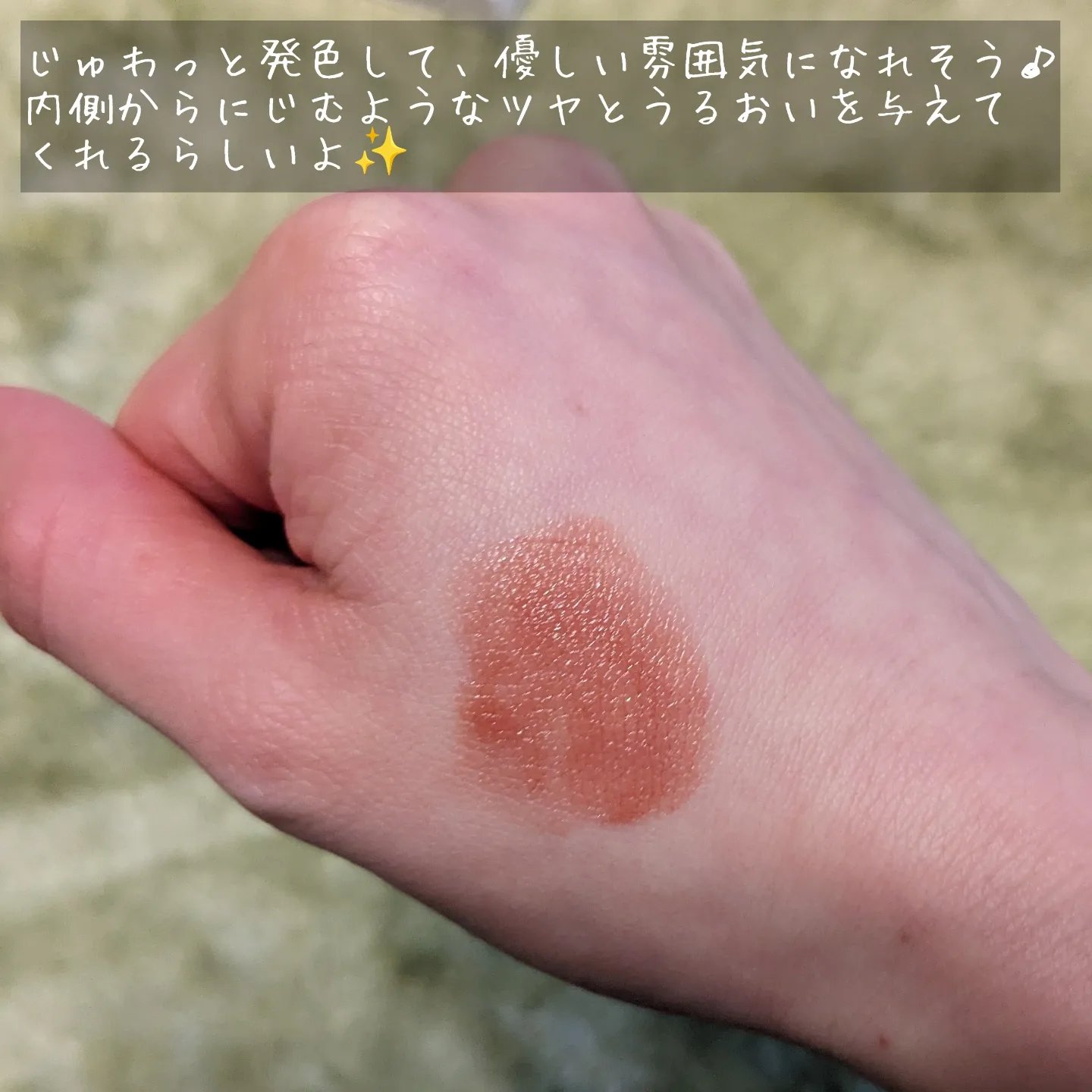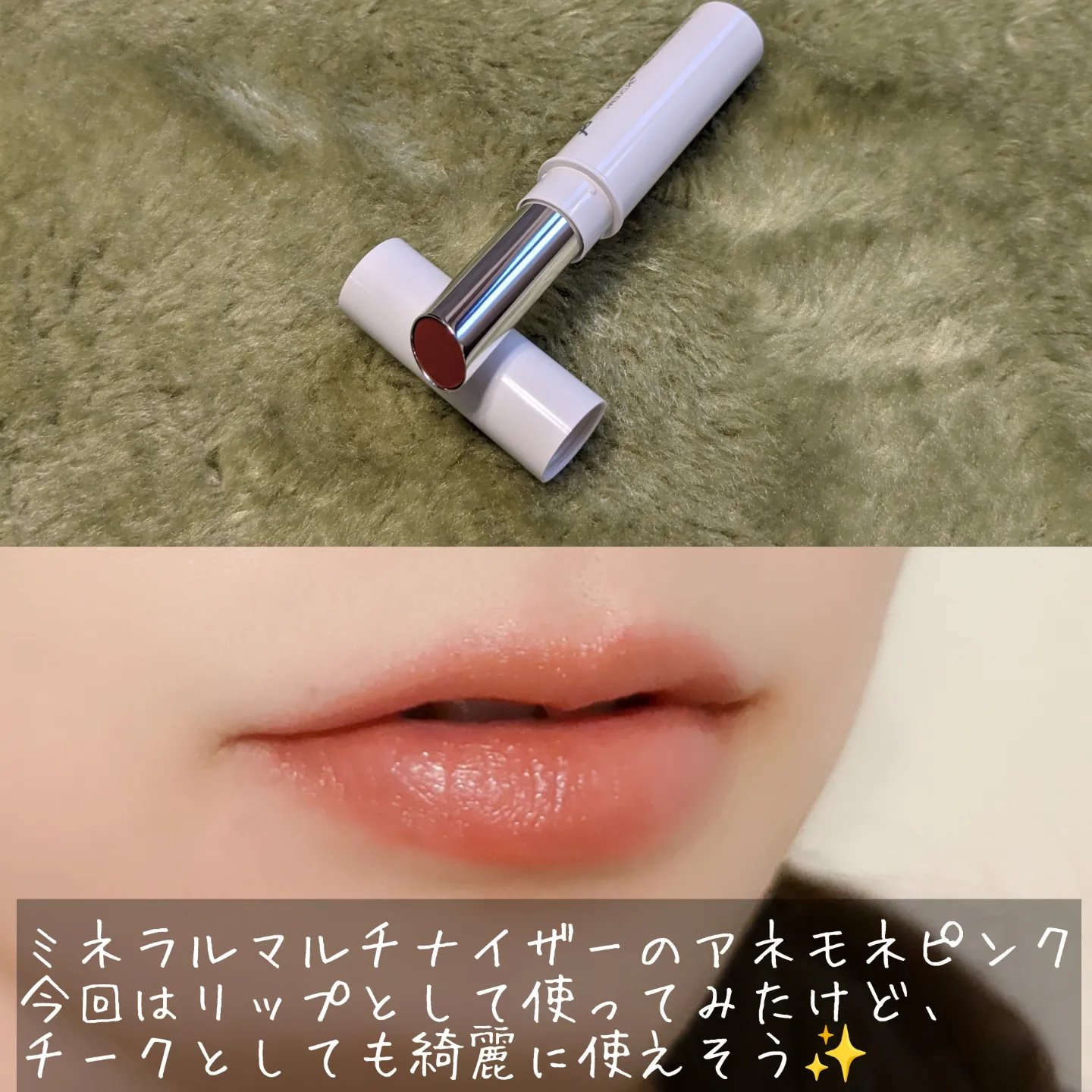 再度控えめの落ち着いたピンクなので色んな場面で使いやすい! 1度塗りならものすごく自然な発色で、塗り重ねるにつれて淡いピンクがはっきり出てくるので儚げな印象になります✨ ティントじゃないので色持ちはそこそこですが、乾燥に強くてしっとりが続くのが気に入ってます✨ ナチュラルコスメなので石鹸で落とせます✨ お肌にも優しいのでリップ荒れが気になる方にもオススメです︎💕