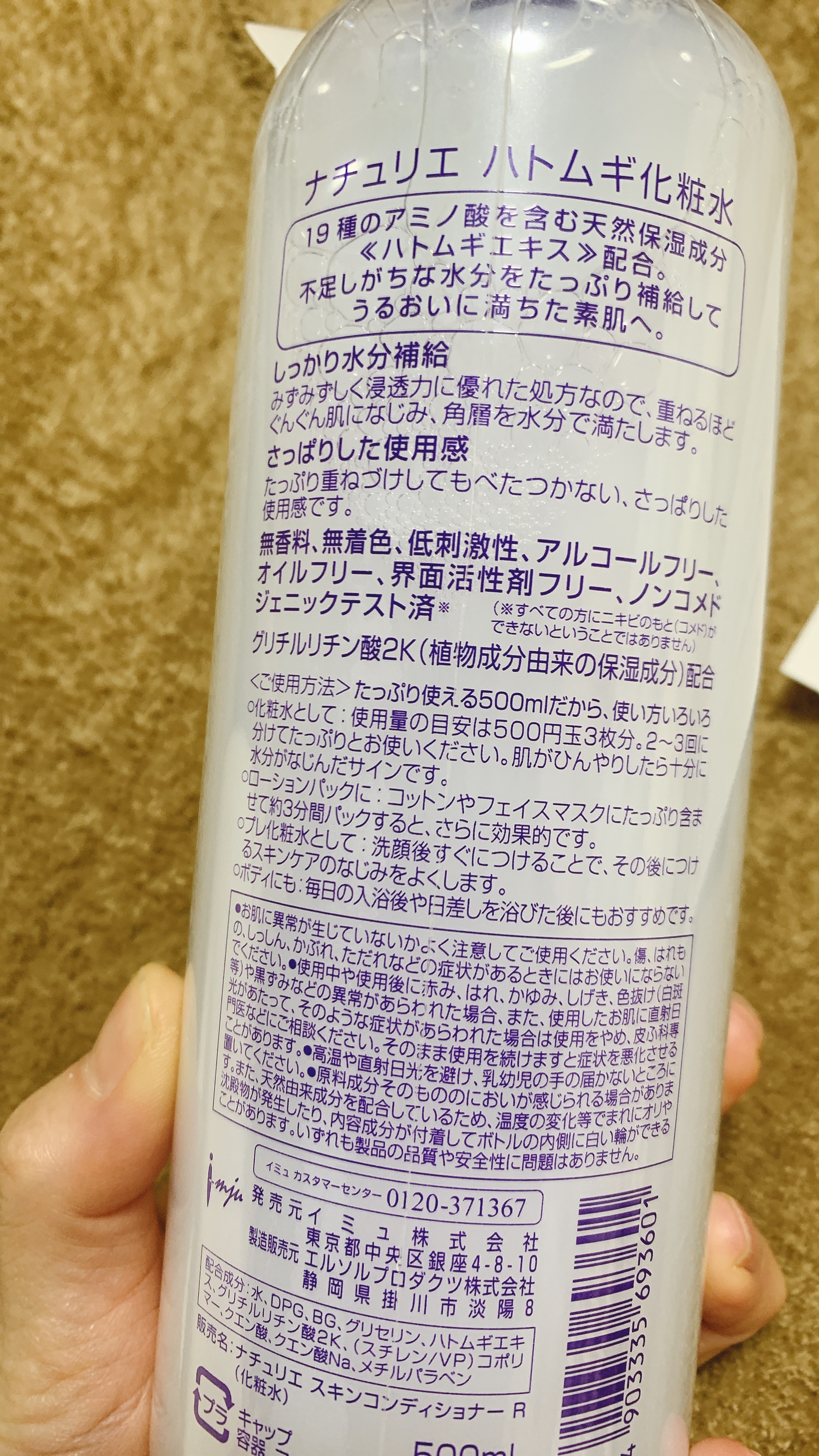 - <通常サイズ 500ml> 水、DPG、BG、グリセリン、ハトムギエキス、グリチルリチン酸2K、(スチレン/VP)コポリマー、クエン酸、クエン酸Na、メチルパラベン <500ml+ 限定ムーミンデザインボトル> 水、DPG、BG、グリセリン、ハトムギエキス、グリチルリチン酸2K、(スチレン/VP)コポリマー、クエン酸、クエン酸Na、メチルパラベン <詰め替えタイプ 480ml> 水、DPG、BG、グリセリン、ハトムギエキス、グリチルリチン酸2K、(スチレン/VP)コポリマー、クエン酸、クエン酸Na、メチルパラベン <旧製品> BG、グリセリン、メチルパラベン、エタノール、グリチルリチン酸2K、ハトムギエキス、DPG、クエン酸Na、プロピルパラベン、クエン酸、(スチレン/アクリレーツ)コポリマー、水 <限定ムーミンデザイン> 水、DPG、BG、グリセリン、ハトムギエキス、グリチルリチン酸2K、(スチレン/VP)コポリマー、クエン酸、クエン酸Na、メチルパラベン