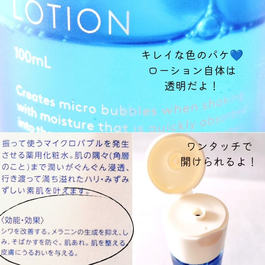 振ってファインバブルを発生させる日本初の化粧水、それが薬用マイクロバブルローション✨ 肌に心地よく馴染みます🌿 2回、3回とたっぷり肌に化粧水をつけてもベタつかず、どんどん吸収していく感じがすごくいいです! 肌荒れなどの抗炎症効果のある有効成分グリチルリチン酸ジカリウムが入っているのも嬉しい♡