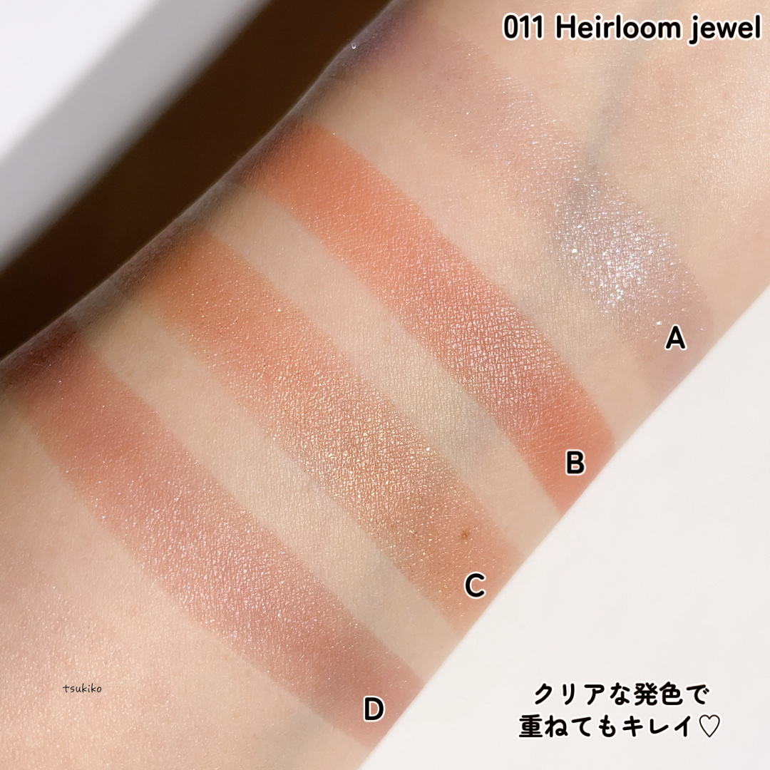 - <001 Cashmere Dream> タルク、ホウケイ酸(Ca/Al)、⽔添ポリイソブテン、合成フルオロフロゴパイト、ミネラル オイル、リンゴ酸ジイソステアリル、PET、メタクリル酸メチルクロスポリマー、トリエチル ヘキサノイン、ワセリン、トコフェロール、(トリフルオロプロピルジメチコン/トリフルオ ロプロピルジビニルジメチコン)クロスポリマー、(ビニルジメチコン/ラウリルジメチコン) クロスポリマー、イソドデカン、エチルヘキサン酸セチル、シリカ、ジメチコン、セスキイソ ステアリン酸ソルビタン、セスキステアリン酸ソルビタン、トリエトキシカプリリルシラン、トリフルオロプロピルシクロテトラシロキサン、トリフルオロプロピルシクロペンタシロキサ ン、ヘキサ(ヒドロキシステアリン酸/ステアリン酸/ロジン酸)ジペンタエリスリチル、酸 化スズ、⽔酸化Al、クロルフェネシン、カルミン、グンジョウ、マイカ、酸化チタン、酸化亜 鉛、酸化鉄、硫酸Ba、⻩4 <002 Everlasting Lilac> タルク、合成フルオロフロゴパイト、⽔添ポリイソブテン、ミネラルオイル、リンゴ酸ジイソ ステアリル、ホウケイ酸(Ca/Al)、PET、トリエチルヘキサノイン、ワセリン、メタクリル 酸メチルクロスポリマー、トコフェロール、(トリフルオロプロピルジメチコン/トリフルオ ロプロピルジビニルジメチコン)クロスポリマー、(ビニルジメチコン/ラウリルジメチコン) クロスポリマー、イソドデカン、エチルヘキサン酸セチル、シリカ、ジメチコン、セスキイソ ステアリン酸ソルビタン、セスキステアリン酸ソルビタン、トリフルオロプロピルシクロテト ラシロキサン、トリフルオロプロピルシクロペンタシロキサン、ヘキサ(ヒドロキシステアリ ン酸/ステアリン酸/ロジン酸)ジペンタエリスリチル、酸化スズ、⽔酸化Al、クロルフェネ シン、カルミン、グンジョウ、マイカ、酸化チタン、酸化亜鉛、酸化鉄、硫酸Ba <003 Marriage Vow> タルク、⽔添ポリイソブテン、合成フルオロフロゴパイト、ホウケイ酸(Ca/Al)、ミネラル オイル、リンゴ酸ジイソステアリル、メタクリル酸メチルクロスポリマー、トリエチルヘキサ ノイン、PET、ワセリン、トコフェロール、(トリフルオロプロピルジメチコン/トリフルオ ロプロピルジビニルジメチコン)クロスポリマー、(ビニルジメチコン/ラウリルジメチコン) クロスポリマー、イソドデカン、エチルヘキサン酸セチル、シリカ、ジメチコン、セスキイソ ステアリン酸ソルビタン、セスキステアリン酸ソルビタン、トリエトキシカプリリルシラン、トリフルオロプロピルシクロテトラシロキサン、トリフルオロプロピルシクロペンタシロキサ ン、ヘキサ(ヒドロキシステアリン酸/ステアリン酸/ロジン酸)ジペンタエリスリチル、酸 化スズ、⽔酸化Al、カルミン、グンジョウ、マイカ、酸化チタン、酸化亜鉛、酸化鉄、硫酸 Ba、⻩4 <004 Timeless Gold> タルク、合成フルオロフロゴパイト、⽔添ポリイソブテン、ミネラルオイル、リンゴ酸ジイソ ステアリル、ホウケイ酸(Ca/Al)、PET、トリエチルヘキサノイン、メタクリル酸メチルク ロスポリマー、ワセリン、トコフェロール、(トリフルオロプロピルジメチコン/トリフルオ ロプロピルジビニルジメチコン)クロスポリマー、(ビニルジメチコン/ラウリルジメチコン) クロスポリマー、イソドデカン、エチルヘキサン酸セチル、シリカ、ジメチコン、セスキイソ ステアリン酸ソルビタン、セスキステアリン酸ソルビタン、トリフルオロプロピルシクロテト ラシロキサン、トリフルオロプロピルシクロペンタシロキサン、ヘキサ(ヒドロキシステアリ ン酸/ステアリン酸/ロジン酸)ジペンタエリスリチル、ラウリン酸亜鉛、酸化スズ、⽔酸化 Al、クロルフェネシン、グンジョウ、マイカ、酸化チタン、酸化亜鉛、酸化鉄、硫酸Ba <005 Vintage Tutu> タルク、合成フルオロフロゴパイト、⽔添ポリイソブテン、ミネラルオイル、ホウケイ酸(Ca /Al)、リンゴ酸ジイソステアリル、トリエチルヘキサノイン、メタクリル酸メチルクロスポ リマー、ワセリン、PET、トコフェロール、(トリフルオロプロピルジメチコン/トリフルオ ロプロピルジビニルジメチコン)クロスポリマー、(ビニルジメチコン/ラウリルジメチコン) クロスポリマー、イソドデカン、エチルヘキサン酸セチル、シリカ、ジメチコン、セスキイソ ステアリン酸ソルビタン、セスキステアリン酸ソルビタン、トリフルオロプロピルシクロテト ラシロキサン、トリフルオロプロピルシクロペンタシロキサン、ヘキサ(ヒドロキシステアリ ン酸/ステアリン酸/ロジン酸)ジペンタエリスリチル、酸化スズ、⽔酸化Al、クロルフェネ シン、カルミン、グンジョウ、マイカ、酸化チタン、酸化亜鉛、酸化鉄、硫酸Ba、⻩4 <006 First Romance> タルク、合成フルオロフロゴパイト、⽔添ポリイソブテン、ミネラルオイル、リンゴ酸ジイソ ステアリル、ホウケイ酸(Ca/Al)、メタクリル酸メチルクロスポリマー、トリエチルヘキサ ノイン、ワセリン、PET、トコフェロール、(ト