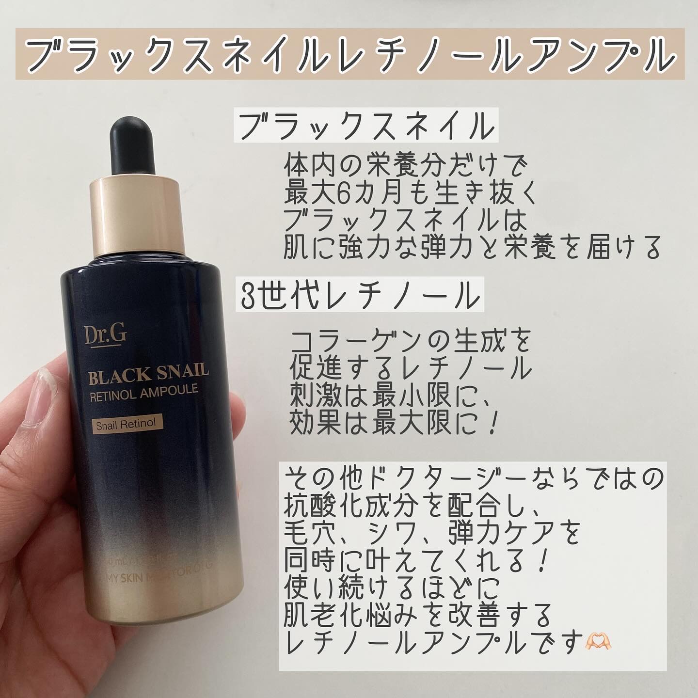 ブラックスネイルレチノールセラムは、ブラックスネイルと低刺激のレチノールを配合した美容液👏✨ 従来のレチノールの特徴、第1世代の効果は高いけど刺激の強いレチノール、第2世代の効果は低いけど刺激の少ないレチノールの長所だけを活かして、刺激が少なく効果の高い第3世代レチノールと、ブラックスネイルを配合した、ブラックスネイルレチノールという成分をDr.Gが独自開発😍💓 濃厚な美容液で、ぷるんっとツヤ感のある肌づくり💗