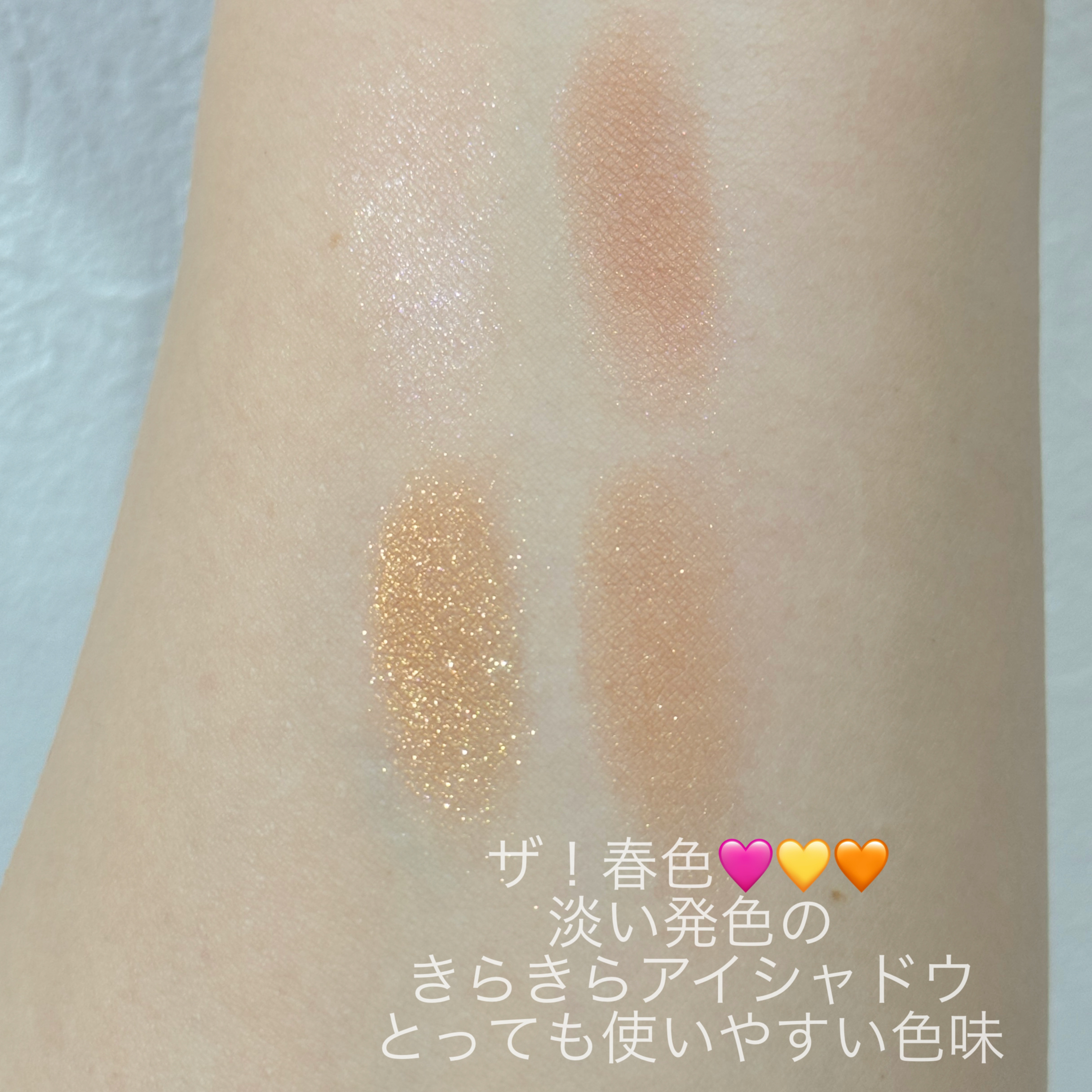 色味も質感も最高です! マットもパールもラメも入っているので 本当にどんなシチュエーションでも使いやすいです! めちゃくちゃ可愛い色で 発売前から一目惚れしてました! まだ購入してそんなに日にちは経ってませんが ここ最近出番が多いアイシャドウです! くすみ系が苦手な私でも使いやすい色味なので くすみ系苦手な方も挑戦しやすいパレットかなと思います! このアイシャドウはザ!春色!なカラーです! このアイシャドウは少し淡い発色で使いやすいです! そしてラメもギラギラしすぎずとっても可愛くて 暖かくなってきたら使いたいアイシャドウです!