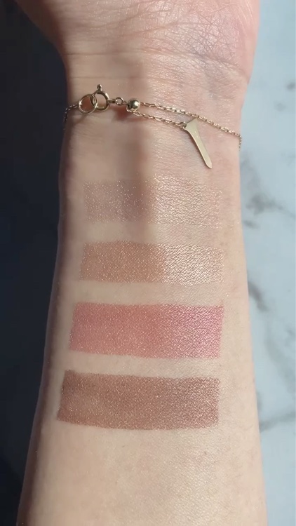 ツヤと血色感、両方手に入る欲張りチーク✨ 粘度が低い液体で、サッと滑らせるだけでも綺麗につきます(スウォッチは指で3回伸ばした) 指で伸ばしてから境目をぽんぽんするだけでも良いですが、スポンジで丁寧に馴染ませるとより自然な仕上がりに✨ スウォッチはピーチピンク&ゴールデンシマーのゴールドパールが目立ちますが、少量頬につけて馴染ませると意外とキラキラした感じがなくて艶に見えます👀 ブルベなので、ソフトライラック1本だけでも良かったんですが、青みが少ないアイメイクをする時はモーヴピンクを使うことも ピーチピンク&ゴールデンシマーはゴールドパールが入っているのでマットのアイシャドウとの相性はちょっと微妙、下2色はどんな質感のアイシャドウとも相性が良いかと思います このリキッドチークは色展開も豊富で購入する時迷いましたが(3/12現在で9色)、モーヴピンクかソフトライラックが失敗が少ないかもしれません
