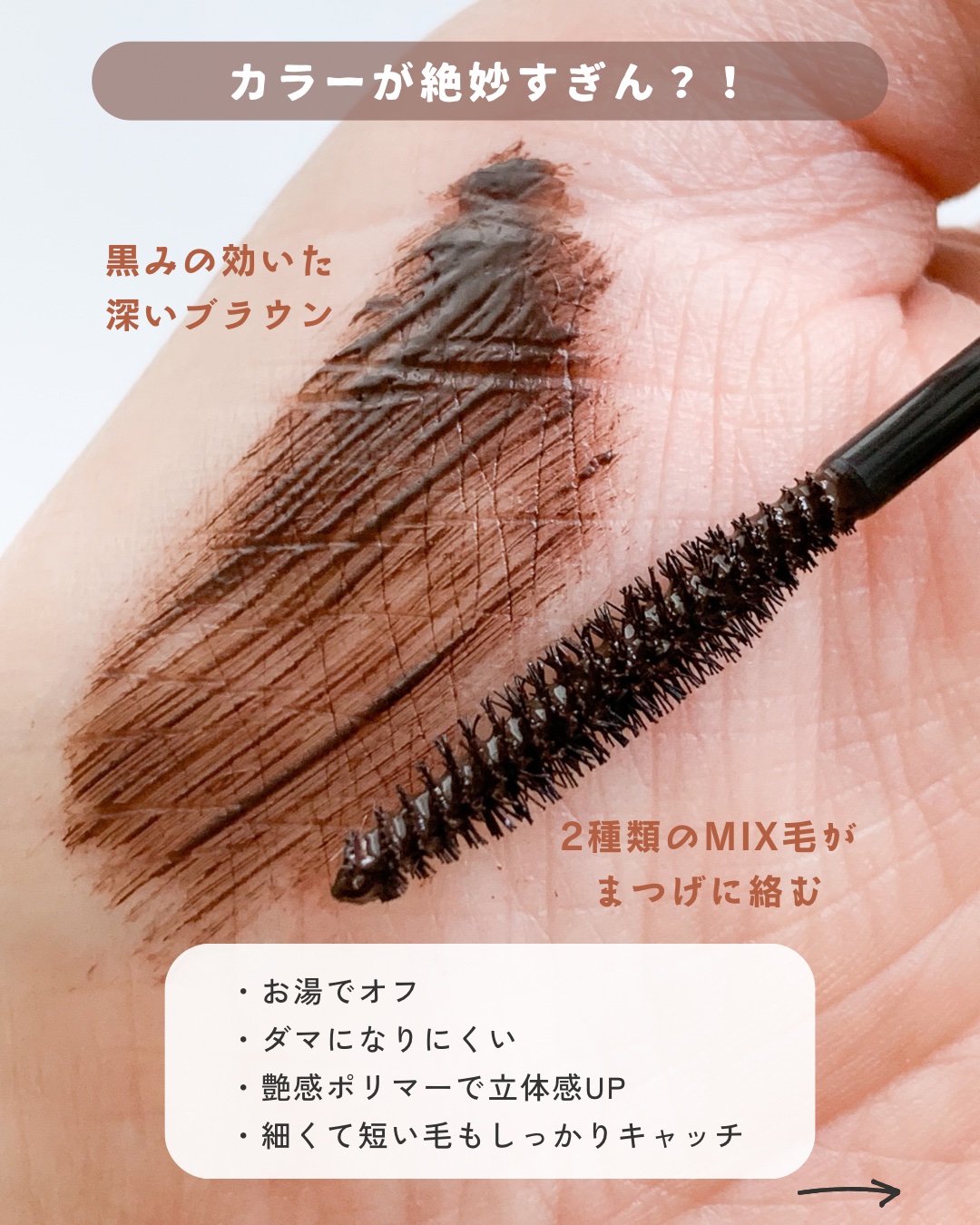自まつ毛がスーッと伸びたような自然なセパレートまつ毛に仕上がります🥺 特にお気に入りなのはピュアブラウン🤎 美容家の神崎恵さんこだわりの“黒みブラウン”で柔らかい印象だけどナチュラルに盛れる😍 ウォータープルーフなのにお湯で簡単オフできるのがとっても魅力的でお気に入り✨