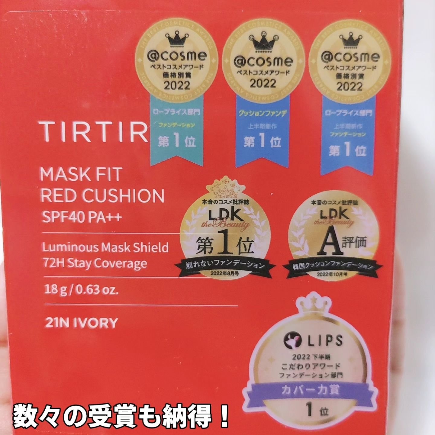 - LIPSベストコスメ2023 クッションファンデ部門3位LIPSベストコスメ2023 上半期こだわりアワード ファンデーション部門カバー力賞1位LIPSベストコスメ2023 上半期こだわりアワード ファンデーション部門崩れにくい賞2位LIPSベストコスメ2022 下半期こだわりアワード ファンデーション部門カバー力賞1位LIPSベストコスメ2022 下半期こだわりアワード ファンデーション部門崩れにくい賞2位LIPSベストコスメ2022 LIPSベストコスメ2022上半期 カテゴリ クッションファンデ 第2位