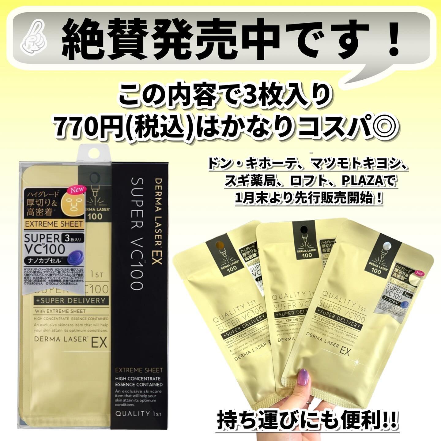 クオリティファーストダーマレーザーEXスーパーVC100マスク4種のビタミンC*で集中毛穴**ケア🫧スーパーVC100マスクと美容液は同じだけど1枚に35mlも含んでて3層構造の厚手シートが密着感あって◎透け感のないエクストリームシートで厚み...