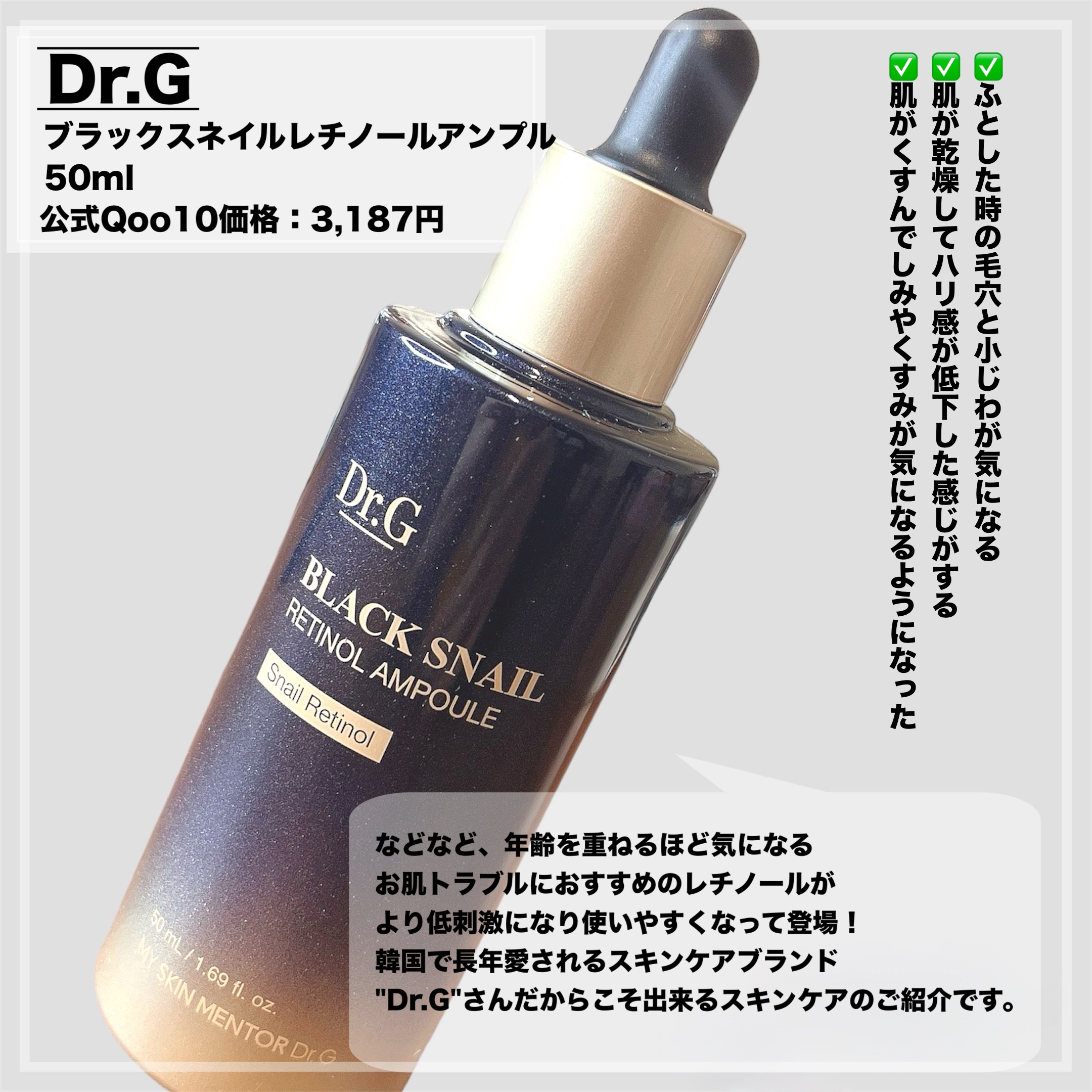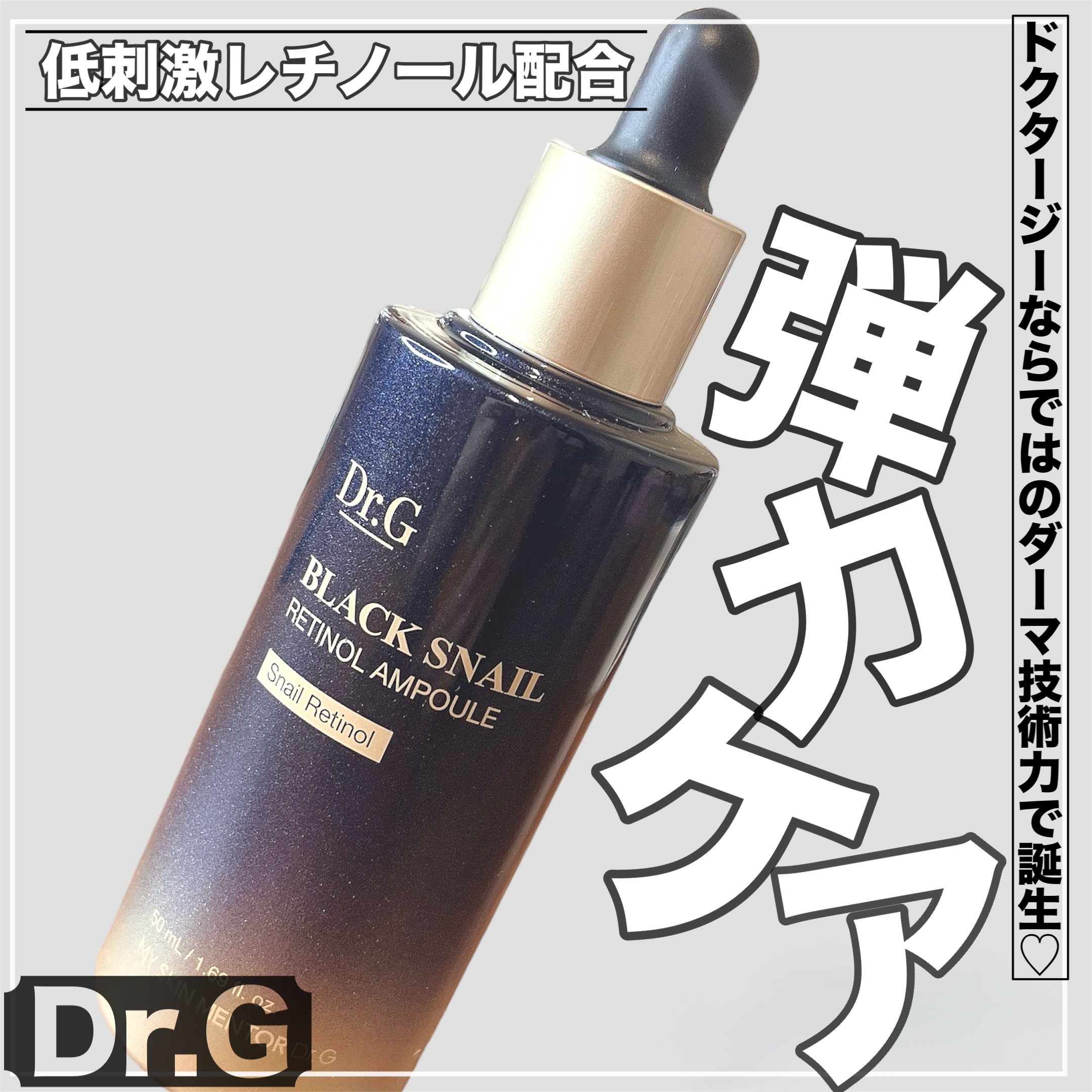 - ブラックスネイル*とレチノール*を配合した、若々しい肌印象に導く美容液です。 Dr.Gのレチノールは独自の成分である、ブラックスネイルレチノール*を使っています! 肌に高い保湿感を与え、肌のキメを整え、弾力やハリのケアを助けるだけでなく、肌の乾燥くすみをケアし、明るい印象のぷるんっとハリのある肌に導きます。 *整肌成分