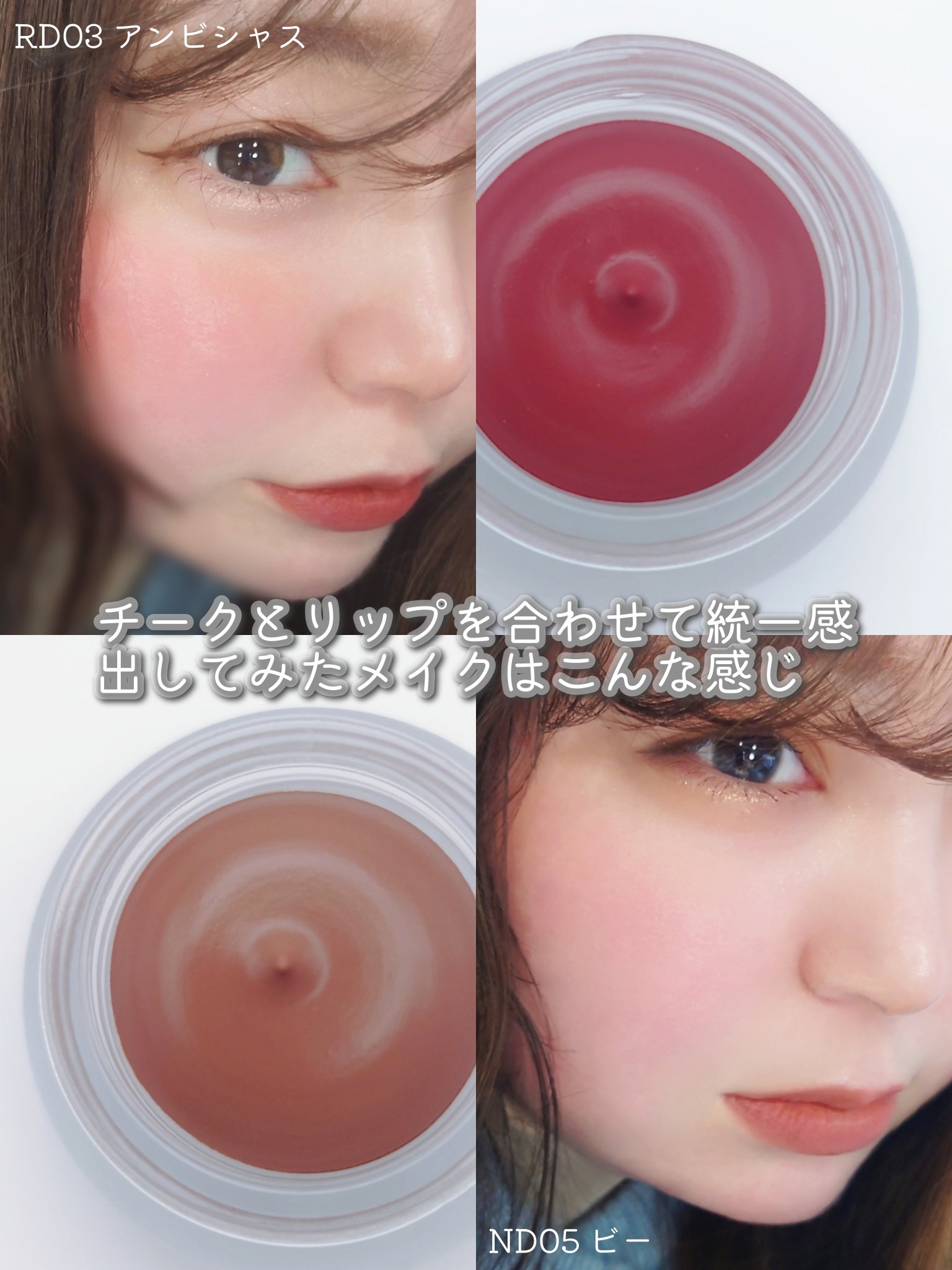 ガラスの容器に丸いフタが可愛い☺️ 私はRD04とND05を購入しました! ふわふわのスフレみたいなマット質感が癖になります。 特にBEはチークにも可愛くて、イエベさんにおすすめ。リップだと逆にベージュ感が強いです。