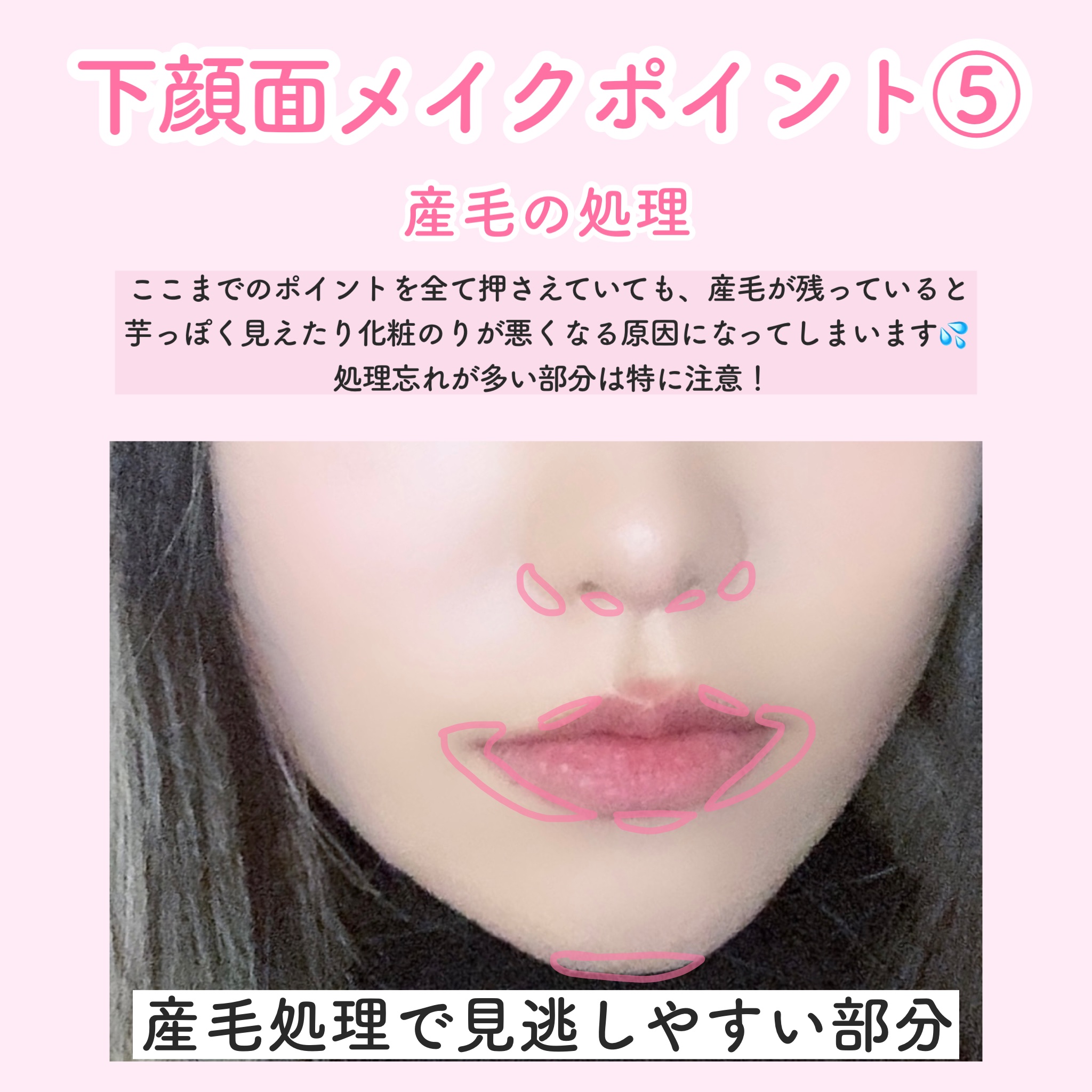蒸しタオルで肌を温める 肌や産毛を柔らかくすることで、カミソリの刃が引っかかりにくくなり肌を傷付けるリスクを軽減することが出来ます。 正しい方向に向かって剃る 写真の矢印の方向に向かって産毛を剃っていきます。 見逃しがちなゾーン ④唇のキワ 見えにくい透明の産毛が潜んでいることが多いです。