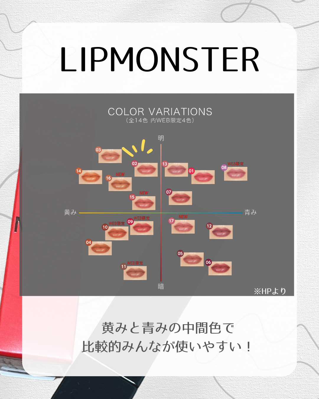 - 落ちにくさも美発色もよくばりたい、つけたての色が長時間持続する人気の口紅リップモンスター。 唇から蒸発する水分を活用して密着ジェル膜に変化する独自技術※で、つけたての色が長時間持続。 高発色&保湿。 ※当社独自の色持ち技術 ■花火のようにまぶしくきらめく 繊細なラメが際立つ限定色 EX-6 ピンクカラー×青ラメ【ロケット花火流星群】 EX-7 オレンジカラー×黄&緑ラメ【100万発の線香花火】 EX-8 レッドカラー×緑ラメ【打ち上げ花火ブランコ】 ■深みレッド系カラーの限定色 EX-9 戦慄の喜笑 (限定色) EX-10 狂気の怒号 (限定色) 【2025クリスマスコフレ】 落ちにくいリップモンスターから、唇の血色感を底上げする ホリデーシーズン限定の熱感ニュアンスベージュ系カラー登場。 EX-11 紅煙宿る贈り物(限定色):ボルドーベージュ系 EX-12 盗まれた1224mの星光(限定色):キャメルベージュ系
