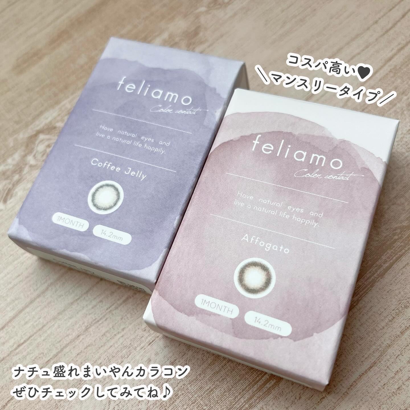 - ※2025年6月以降、商品パッケージ裏面・側面の一部表記を順次変更いたします。尚、これにかかる商品の交換・返品は承っておりません。 どんな瞬間にも溶け込む誰からも愛される瞳へ feliamoの由来は felice amore~幸せな愛~ 瞳から愛されオーラを放つ好印象レンズで女性らしさと品を演出。 オンも、オフも、特別な日も。 どんな場面にも溶け込むレンズラインナップで誰からも愛される瞳に。 ■うるつや透明感 × こっそり盛れ ナチュラルレンズ Coffee Jelly(コーヒーゼリー) ■じゅわっと透明感 × ふんわり盛れ すこし大きめレンズ Affogato(アフォガード) ■ナチュラル細フチ×裸眼盛れ トキメキうるみレンズ Oolong Tea(ウーロンティー) ■トレンド太フチ×くりっと盛れ 無敵ブラウンレンズ Tarte Tatin(タルトタタン) ■じゅわっとフチ×甘かわ盛れ あざとブラウンレンズ Tiramisu Ring(ティラミスリング) ■シュガーパール 大人気カラーBrulee Pearl(ブリュレパール)の色違いグレーレンズ! 細フチの使いやすいグレーで、どんな瞳の色(黒目・茶目)でもナチュラルに光をとりこみ、うるっと奥行きのあるこなれ可愛い印象に。 おでかけにぴったりなレンズです! 清楚な瞳になれるヒ・ミ・ツは・・・? ちゅるん細フチ×うるキラグレーカラー! ■メルティバター 盛れるのにバレにくい、毎日使えるナチュラルブラウンレンズ! じゅわっととろけるようなブラウンで、ふんわりやさしげな瞳に! どんなメイクにも似合うから毎日使える!自然に盛れる大きめブラウンレンズはfeliamoにお任せ♡ 多幸感のある印象の瞳のヒ・ミ・ツは・・・? ぼかしナチュラルブラウン×じゅんわりとろけるブラウンカラー カラーコンタクトレンズの不適正使用による眼障害の危険性等などがあります。 ●コンタクトレンズは高度管理医療機器です。不十分な洗浄・消毒など不適切なケアや、長時間・交換期間を超えた装用により、アレルギー性結膜炎、角膜感染症、角膜潰瘍等の重篤な眼障害が発生する危険性があります ●ご使用前に取扱説明書を確認してください 使用上の留意事項 ●眼科医院等を受診してからお求めください ●眼に異常を感じたら直ちにレンズ使用を中止し、お近くの眼科等で診察を受けてください ●医師の指示にしたがってご使用ください ●コンタクトレンズを装用する場合、自覚症状がなくても、眼科医院等での定期検査を受けてください ●レンズに不具合がある場合は使用しないでください
