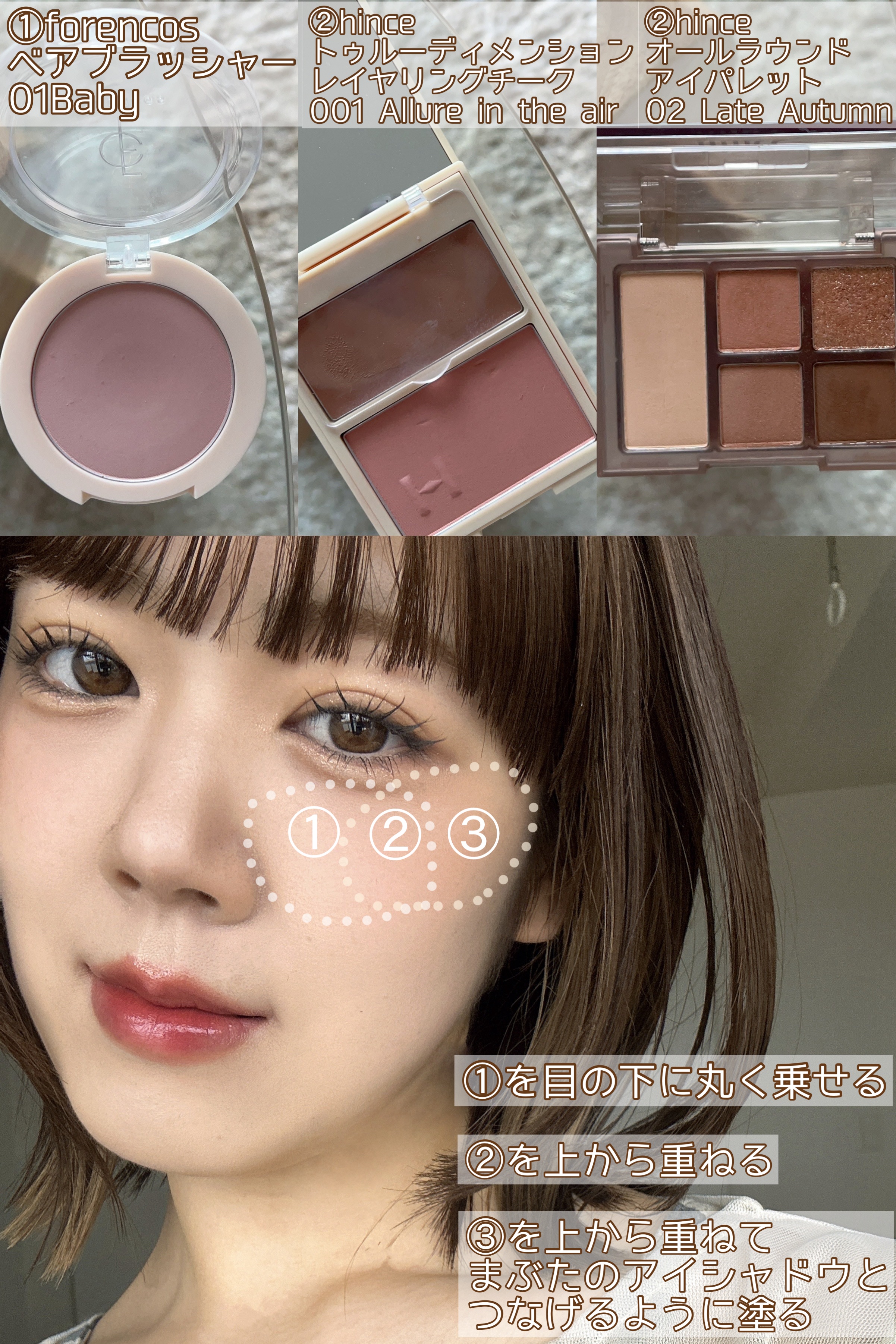 アイシャドウは色味が唯一無二で持ってるだけでおしゃれ気分になれます🧸 発色もとてもいいので調整次第でいろんなメイクができますね! チークはレイヤリングとあるように重ねて使うんですが、オススメの使い方は 1️⃣ファンデの後にクリームチークを少し濃いめに入れる 2️⃣フェイスパウダーをその上に重ねて、その後パウダー状のチークを重ねる こうするとじゅわっとした血色感が演出できて 塗りすぎ感も出ず良かったです◎