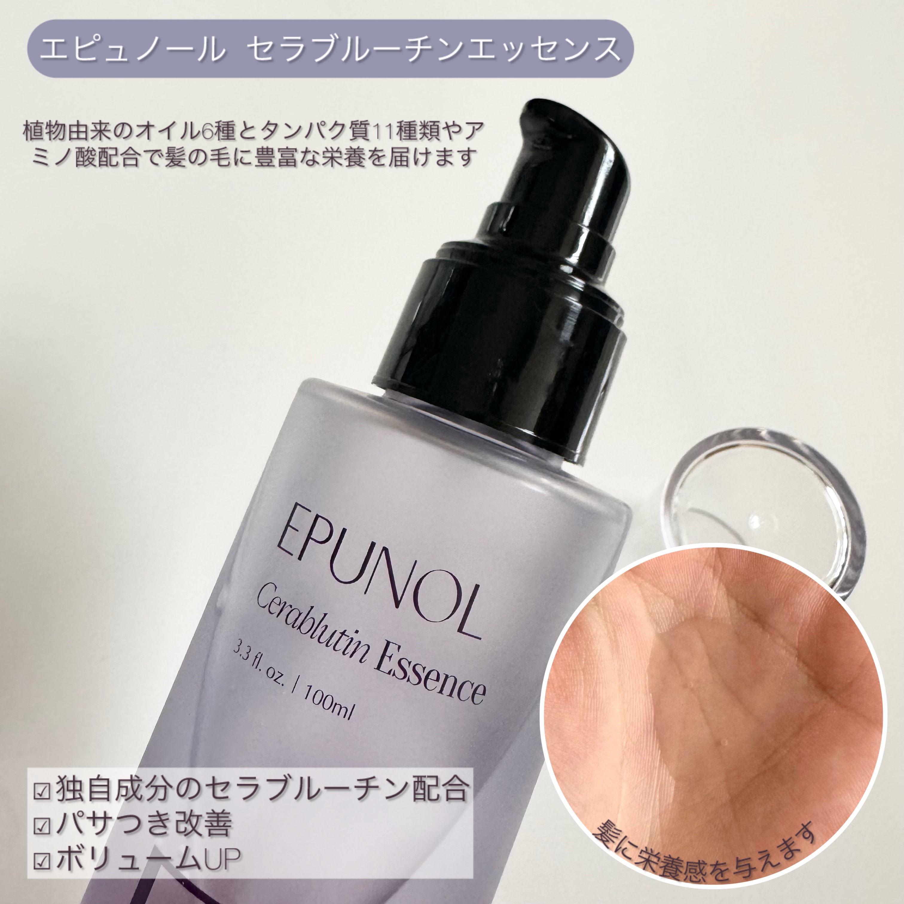 ダメージによるくせ毛を、韓国アイドルのようにサラサラヘアにケア✨ ミルクタンパク質のクリーム層、保湿水分層の2層になっていて容器を振ると完璧なバランスで混ざるスプレーミルクエッセンス🤍 特許取得のVolume Plus成分で、アイドルのようなボリューム感を演出してくれるそう🎀 11種類のタンパク質を含む、エピュノール独自成分セラブルーチン配合のダメージヘア専用プロテインエッセンス✨ 高級フローラルフルーティの香りで、ハイブランドの香水が必要ない贅沢な香りです🌼