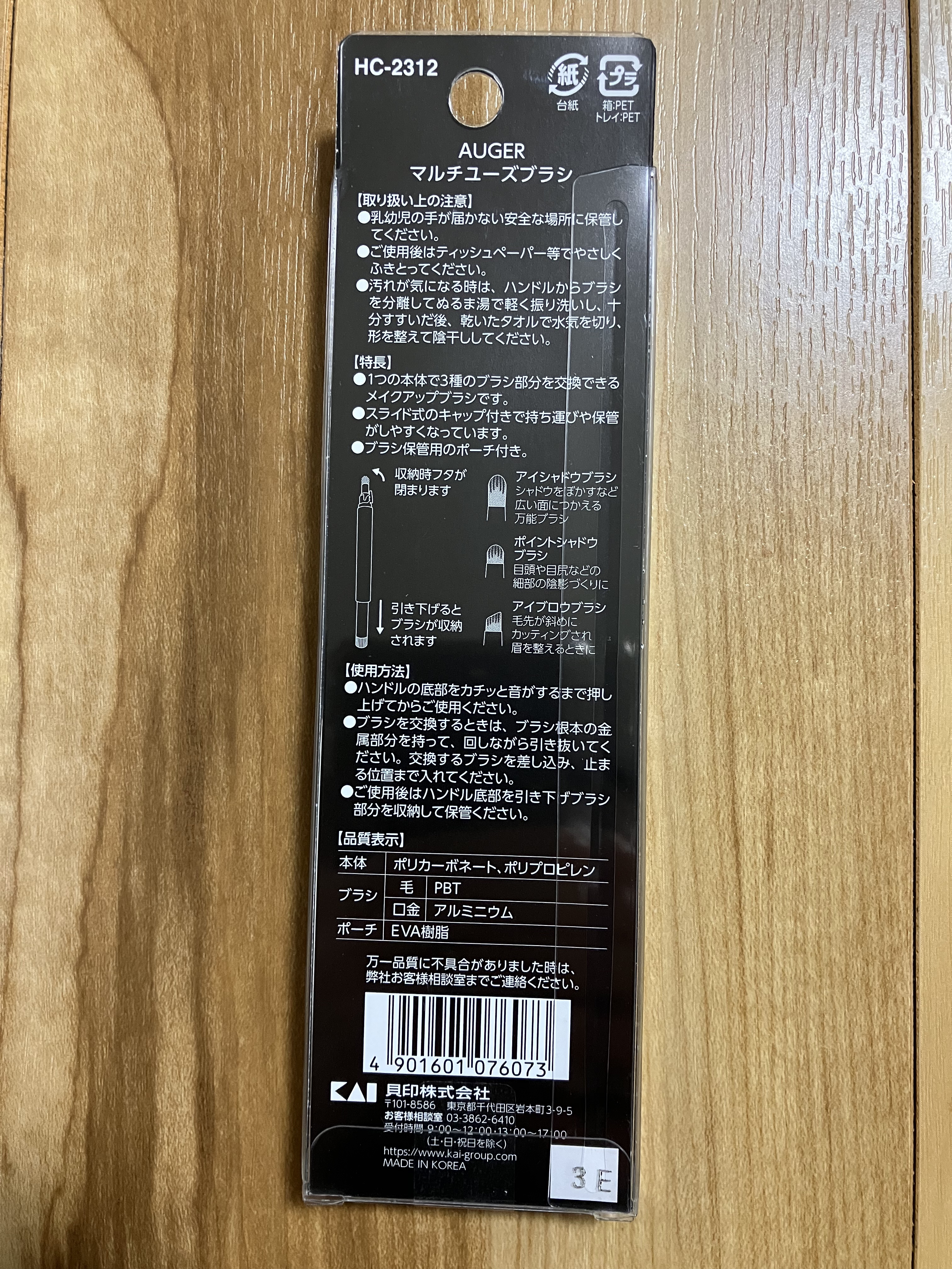 - 本体:ポリカーボネート、ポリプロピレン ブラシ:毛/PBT、口金/アルミニウム ポーチ:EVA樹脂