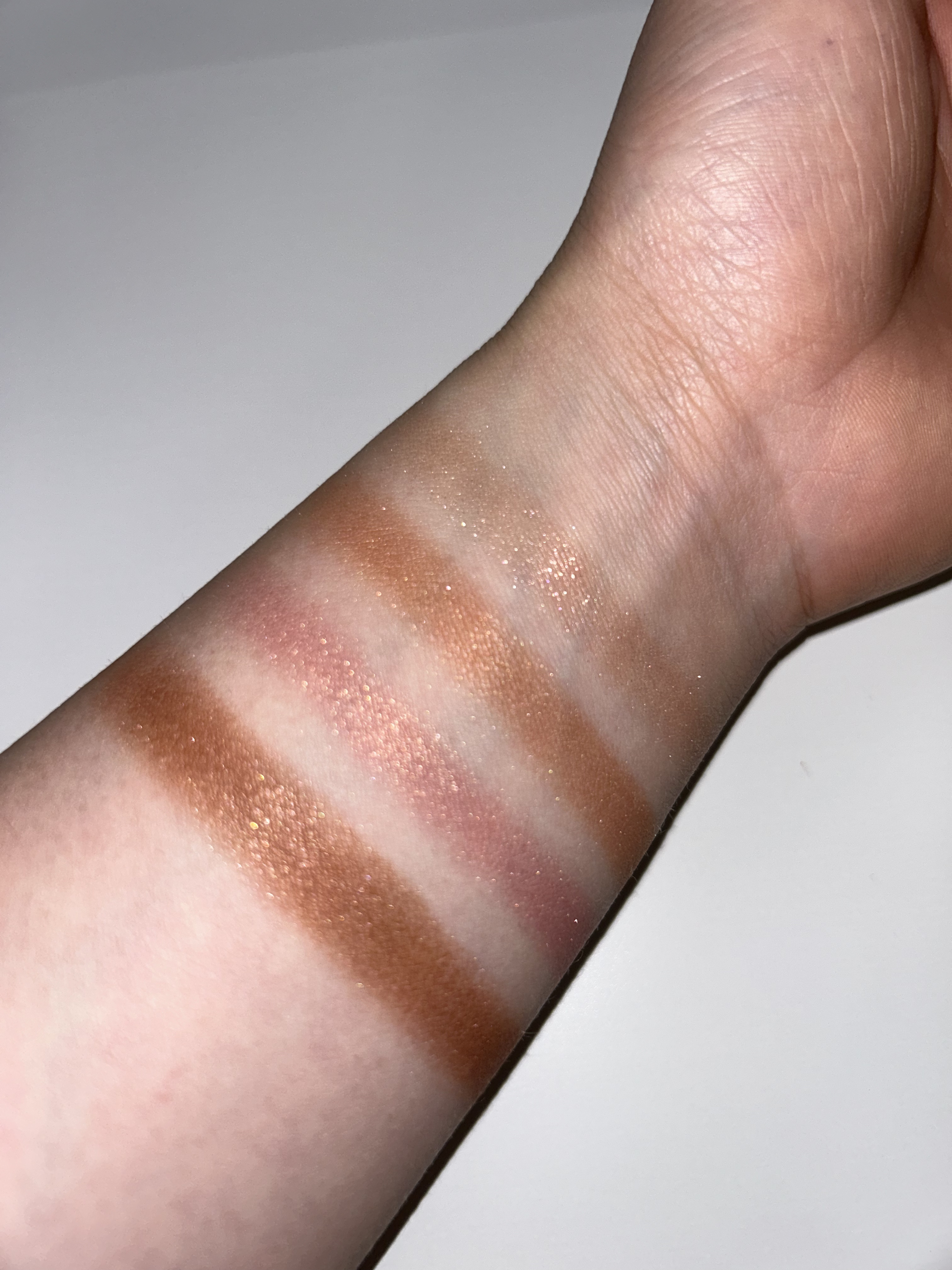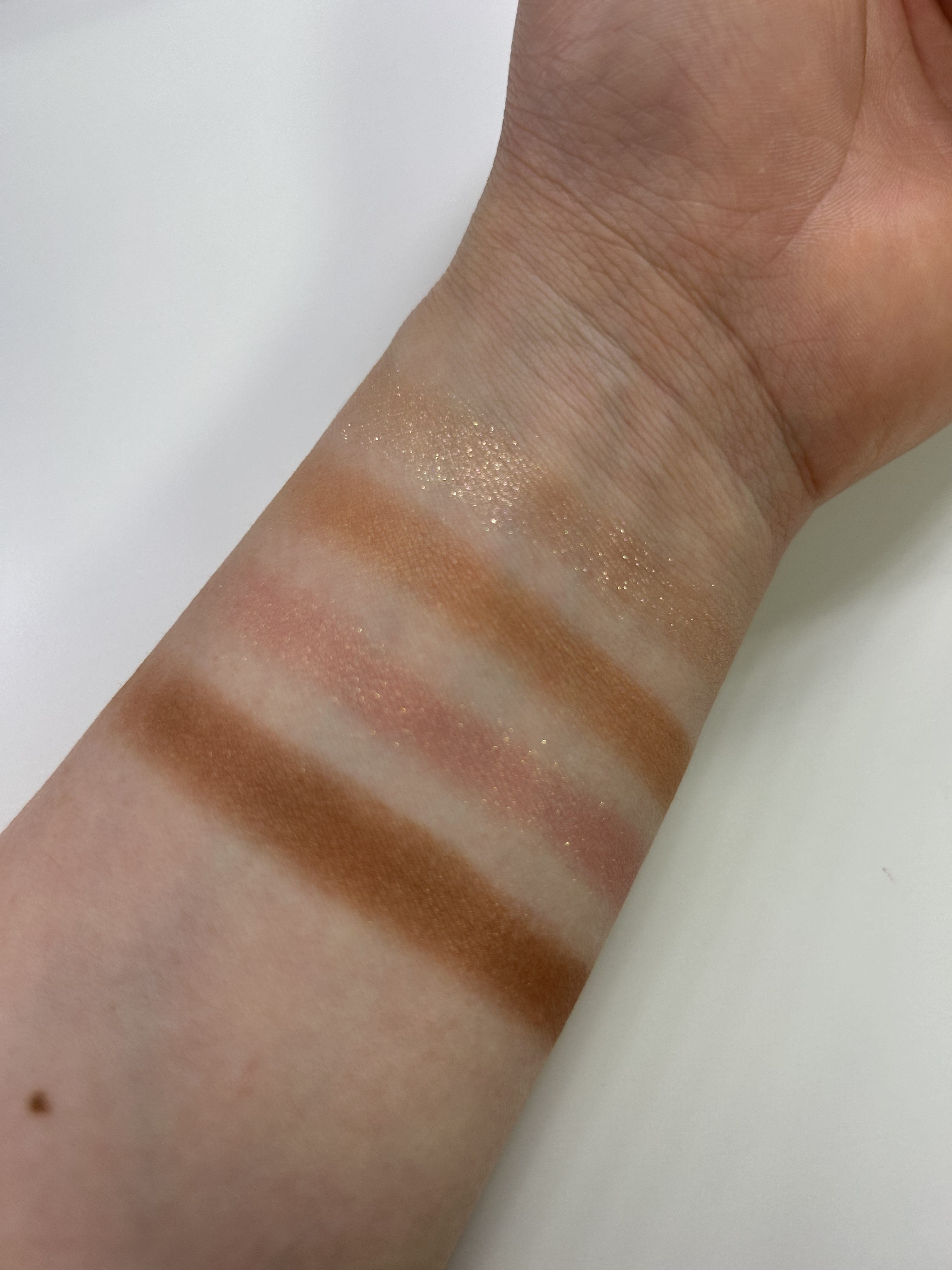 まずアイシャドウ!なんてかわいいオレンジなんでしょう🧡 bの色がボルドーっぽく見えますが、こちらもかなりオレンジで全体的にピンクオレンジのパレットです 粉が柔らかい(ブラシに付きやすい)ので指やチップで塗った方が良さそうだなと思いました💭 粉が柔らかい分、若干顔に落ちやすいというかラメ飛びしやすい感じはありましたが、ほっぺがキラキラになってしまう、、という程では無いので私はあまり気になりませんでした😌 そしてチーク!これがまた好みすぎました〜! スウォッチは色が分かるように数回重ねているのでかなり淡めの発色で使いやすいです✨ 画像よりもピンク感があるかなと思います 肌なじみのいい色でこれから大活躍してくれそうです パールも混ざっているので自然とツヤ肌に仕上がります
