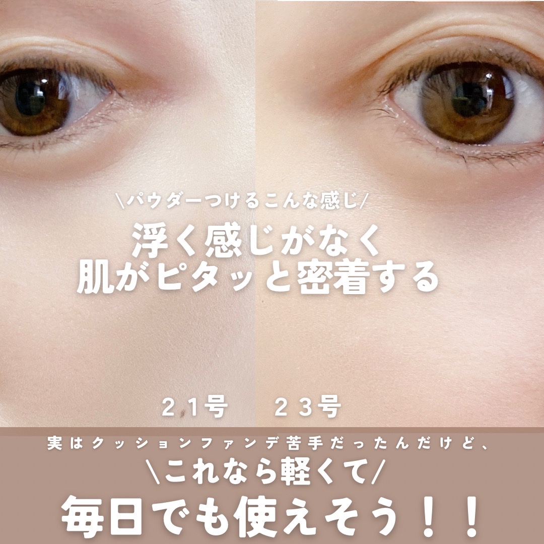 - テクスチャーは、肌が呼吸をするように、軽くて快適な、スキンブリージングテクスチャーです。 スキンケア成分を70%も使っているので、オイル感のあるツヤではなく、しっとりとして潤いが感じられる水分GLOWです。 光の屈折を利用して肌が輝きます。 パフでたたきこむことで、ぴたっと肌に密着し、毛穴もしっかりカバーしてくれます。