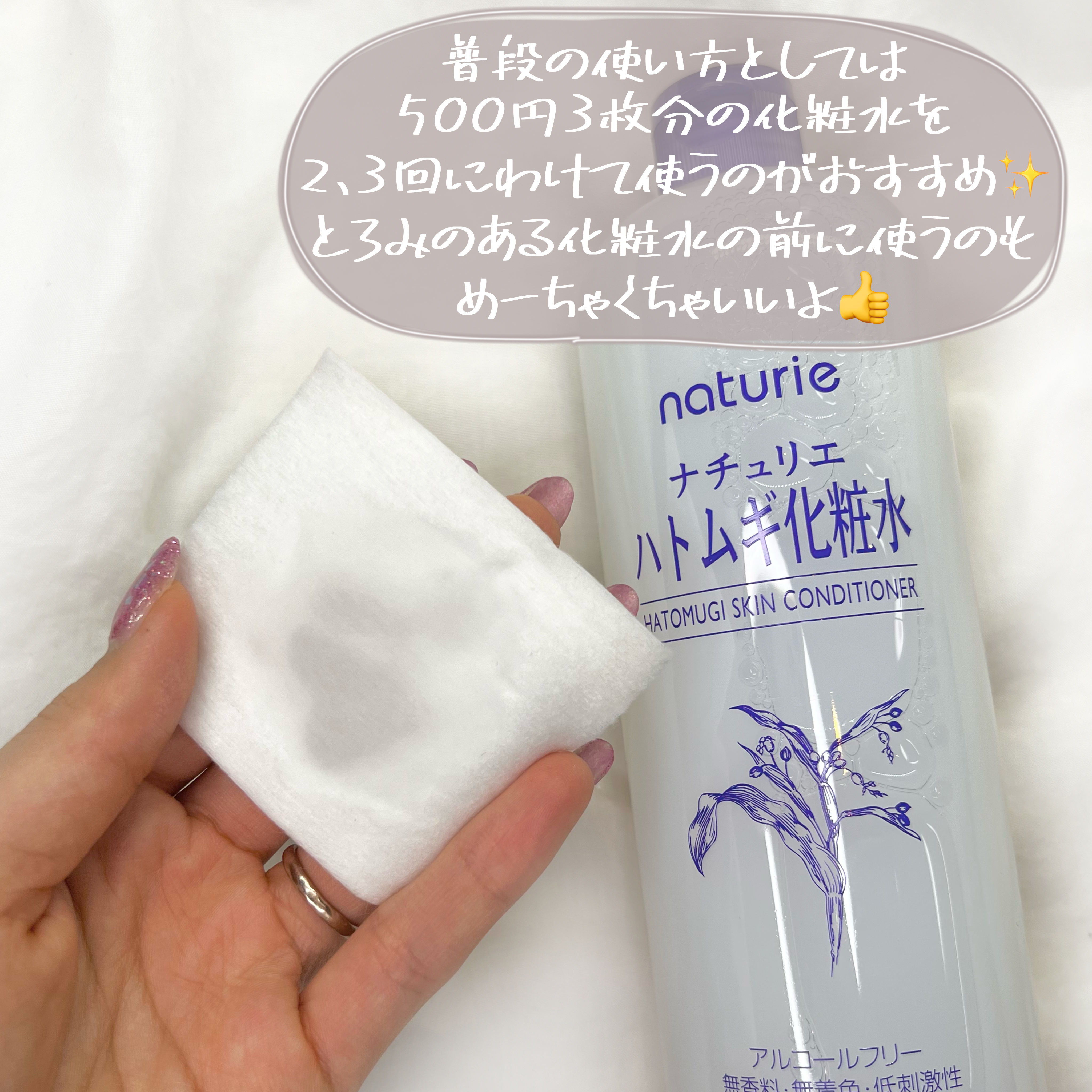 - 肌にうるおいを与えてスキンコンディションを整える、天然保湿成分ハトムギエキス配合の化粧水です。 みずみずしく浸透力に優れた処方なので、重ねるほどぐんぐん肌になじみ、角質層を水分で満たします。 たっぷり肌に重ねづけしてもべたつかないさっぱりした使用感なので、スキンケアのはじめにたっぷり使ってください。 肌がひんやりしてきたら十分に水分がなじんだサインです。 ■基本は化粧水として スキンケアのはじめにたっぷり使ってください。 500円玉大の量を3回重ねづけするのが目安です。 肌がひんやりしてきたら十分に水分がなじんだサインです。 ■ローションパックでさらにうるおい コットンやフェイスマスクにたっぷり含ませて約3分間パックすると、角質水分量がさらに高まります。 ■プレ化粧水として 洗顔後すぐにつけることで、その後につけるスキンケアのなじみをよくします。※角質層まで ■ボディにも べたつかないので、毎日の入浴後や日差しを浴びた後などのボディのスキンケアにもおすすめです。