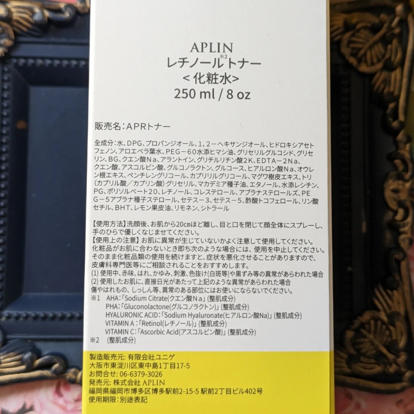 - <150ml> 水、DPG、プロパンジオール、1,2-ヘキサンジオール、ヒドロキシアセトフェノン、アロエベラ葉水、PEG-60水添ヒマシ油、グリセリルグルコシド、グリセリン、BG、クエン酸Na、アラントイン、グリチルリチン酸2K、EDTA-2Na、クエン酸、アスコルビン酸、グルコノラクトン、グルコース、ヒアルロン酸Na、オウレン根エキス、ペンチレングリコール、カプリリルグリコール、マグワ樹皮エキス、トリ(カプリル酸/カプリン酸)グリセリル、マカデミア種子油、エタノール、水添レシチン、PG、ポリソルベート20、レチノール、コレステロール、アブラナステロールズ、PEG-5アブラナ種子ステロール、セテス-3、セテス-5、酢酸トコフェロール、リン酸セチル、BHT、レモン果皮油、リモネン、シトラール