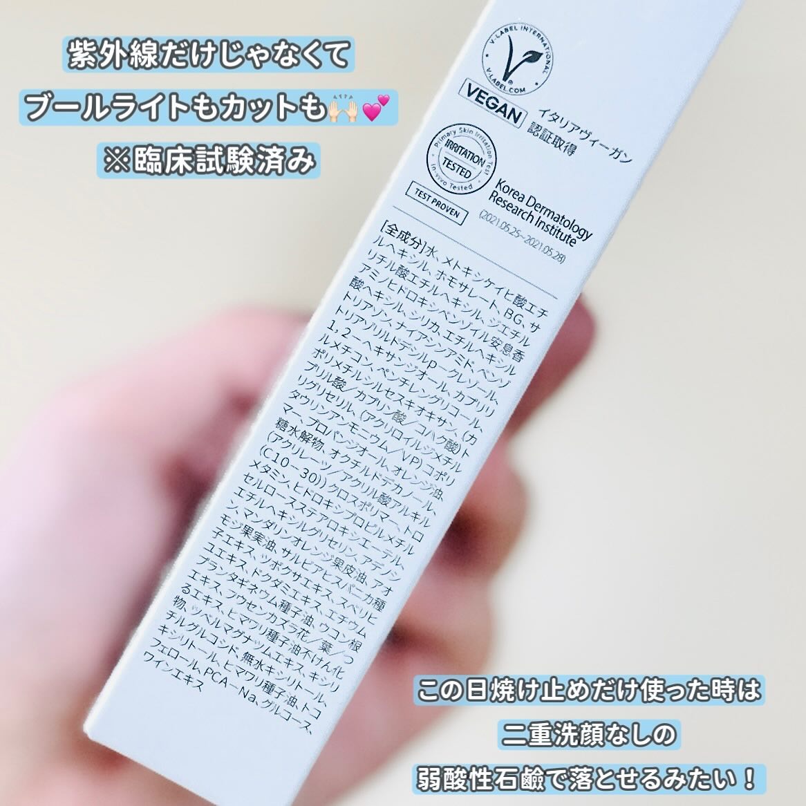 - 日焼けによるしみ、そばかすを防ぎます。水のようななめらかな使用感で、しっとりうるおう日焼け止めクリームです。 SPF50+PA++++ ブルーライトカット イタリアヴィーガン認証V-LABEL取得 皮膚低刺激テスト済み *全ての方に皮膚刺激が発生しないということではありません。 【使い方】 1. スキンケアの最後の段階で適量を取り、肌にまんべんなく馴染ませます。 2. 紫外線に多くさらされる部分は、より厚く塗ることをお勧めします。 *TIP お出かけの30分前にご使用いただければ、より効果的です。 【使用上の注意】 お肌に異常が生じていないかよく注意して使用してください。化粧品がお肌に合わないとき即ち次のような場合には、使用を中止してください。そのまま使用を続けますと、症状を悪化させることがありますので、皮ふ科専門医等にご相談されることをおすすめします。 (1)使用中、赤味、はれ、かゆみ、刺激、色抜け(白斑等)や黒ずみ等の異常があらわれた場合 (2)使用したお肌に、直射日光があたって(1)のような異常があらわれた場合