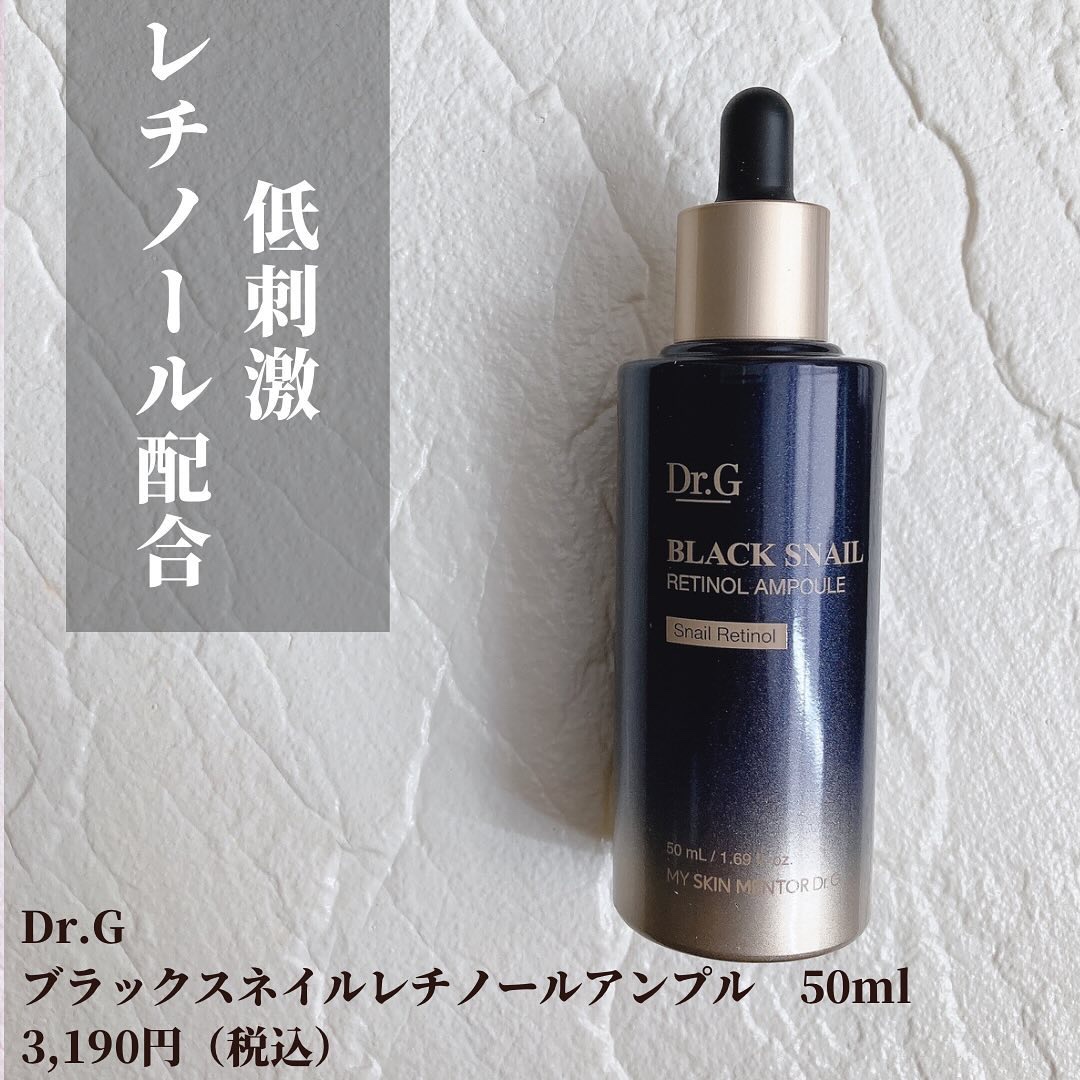 ブラックスネイルと低刺激のレチノールを配合した美容液 とろみがあってミルキーなテクスチャー なめらかにすべるように伸びて気持ちいい使用感で好き ブラックスネイル20%配合クリーム もっちりとした弾力を感じるテクスチャー なめらかに伸びてべたつかない Dr.Gが開発した独自成分のブラックスネイルレチノールは刺激が少なく効果的◎ アトピーもちの敏感肌、乾燥肌だけどトラブルなく使えてるよ♪
