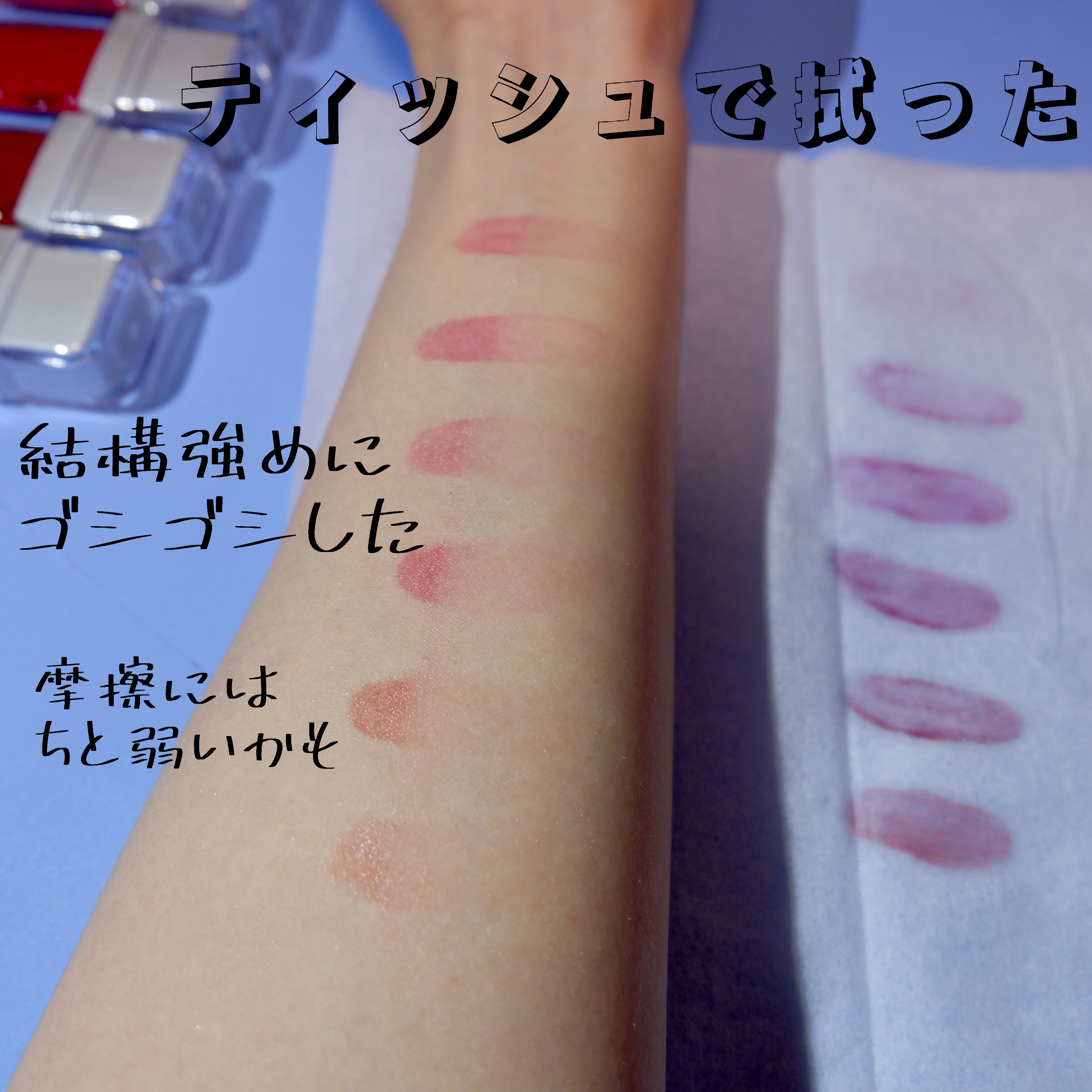 - <01 ソフィー(Surfy)> リンゴ酸ジイソステアリル、ジフェニルシロキシフェニルトリメチコン、精製水、ジフェニルジメチコン、ビスジグリセリルポリアシルアジペート-2、水添ポリイソブテン、ポリグリセリン-3、ポリソルベート60、セチルPEG/PPG-10/1ダイメチコン、イソステアリン酸ソルビタン、BG、ペンチレングリコール、1,2-ヘキサンジオール、ダイメジメチコン、アクリル酸ヒドロキシエチル/ナトリウムアクリロイルジメチルタウリン酸共重合体スクアラン、セテアレス-20、二酸化チタン、エチルヘキシルグリセリン、赤色227号、黄色5 号、香料、赤色104号(1)、水酸化酸化アルミニウム、ポリアクリル酸アンモニウム溶液、黄色4号、フェノキシエタノール、マカデミア種子油、ローズヒップ油、ツバキ油、トコフェロール <02 ピンクラッシュ(Pinkrush)> リンゴ酸ジイソステアリル、ジフェニルシロキシフェニルトリメチコン、精製水、ビスジグリセリルポリアシルアジペート-2、ジフェニルジメチコン、水添ポリイソブテン、ポリグリセリン-3、ポリソルベート60、セチルPEG/PPG-10/1ダイメチコン、イソステアリン酸ソルビタン、BG、ダイメジメチコン、ペンチレングリコール、1,2-ヘキサンジオール、アクリル酸ヒドロキシエチル/ナトリウムアクリロイルジメチルタウリン酸共重合体スクアラン、セテアレス-20、二酸化チタン、エチルヘキシルグリセリン、赤色227号、黄色5 号、香料、水酸化酸化アルミニウム、ポリアクリル酸アンモニウム溶液、フェノキシエタノール、マカデミア種子油、ローズヒップ油、ツバキ油、トコフェロール <03 グレア(Glare) > リンゴ酸ジイソステアリル、ジフェニルシロキシフェニルトリメチコン、精製水、ビスジグリセリルポリアシルアジペート-2、ジフェニルジメチコン、水添ポリイソブテン、ポリグリセリン-3、ポリソルベート60、セチルPEG/PPG-10/1ダイメチコン、イソステアリン酸ソルビタン、BG、ペンチレングリコール、1,2-ヘキサンジオール、ダイメジメチコン、アクリル酸ヒドロキシエチル/ナトリウムアクリロイルジメチルタウリン酸共重合体スクアラン、セテアレス-20、二酸化チタン、エチルヘキシルグリセリン、黄色5 号、香料、赤色104号(1)、赤色227号、水酸化酸化アルミニウム、ポリアクリル酸アンモニウム溶液、黄色4号、フェノキシエタノール、ブリリアントブルーFCF、マカデミア種子油、ローズヒップ油、ツバキ油、トコフェロール <04 ウィッティー(Witty)> リンゴ酸ジイソステアリル、ジフェニルシロキシフェニルトリメチコン、精製水、ビスジグリセリルポリアシルアジペート-2、ジフェニルジメチコン、水添ポリイソブテン、ポリグリセリン-3、ポリソルベート60、セチルPEG/PPG-10/1ダイメチコン、イソステアリン酸ソルビタン、BG、ダイメジメチコン、ペンチレングリコール、1,2-ヘキサンジオール、アクリル酸ヒドロキシエチル/ナトリウムアクリロイルジメチルタウリン酸共重合体スクアラン、セテアレス-20、二酸化チタン、黄色5 号、赤色227号、エチルヘキシルグリセリン、香料、水酸化酸化アルミニウム、ポリアクリル酸アンモニウム溶液、フェノキシエタノール、マカデミア種子油、ローズヒップ油、ツバキ油、トコフェロール <05 パンチ(Punch)> リンゴ酸ジイソステアリル、ジフェニルシロキシフェニルトリメチコン、精製水、ジフェニルジメチコン、ビスジグリセリルポリアシルアジペート-2、水添ポリイソブテン、ポリグリセリン-3、ポリソルベート60、セチルPEG/PPG-10/1ダイメチコン、イソステアリン酸ソルビタン、BG、ペンチレングリコール、1,2-ヘキサンジオール、ダイメジメチコン、アクリル酸ヒドロキシエチル/ナトリウムアクリロイルジメチルタウリン酸共重合体二酸化チタン、スクアラン、セテアレス-20、黄色5 号、エチルヘキシルグリセリン、香料、赤色227号、赤色104号(1)、水酸化酸化アルミニウム、ポリアクリル酸アンモニウム溶液、フェノキシエタノール、マカデミア種子油、ローズヒップ油、ツバキ油、トコフェロール <06 ディア(Dear)> リンゴ酸ジイソステアリル、ジフェニルシロキシフェニルトリメチコン、精製水、ジフェニルジメチコン、ビスジグリセリルポリアシルアジペート-2、水添ポリイソブテン、ポリグリセリン-3、ポリソルベート60、セチルPEG/PPG-10/1ダイメチコン、イソステアリン酸ソルビタン、BG、ペンチレングリコール、1,2-ヘキサンジオール、ダイメジメチコン、アクリル酸ヒドロキシエチル/ナトリウムアクリロイルジメチルタウリン酸共重合体スクアラン、セテアレス-20、二酸化チタン、エチルヘキシルグリセリン、黄色5 号、赤色227号、香料、水酸化酸化アルミニウム、黄色4号、ポリアクリル酸アンモニウム溶液、フェノキシエタノール、マカデミア種子油、ブリリアントブルーFCF、ローズヒップ油、ツバキ油、トコフェロール <07 カインド(Kind)> リンゴ酸ジイソステアリル、ジフェニルシロキシフェニルトリメチコン、精製水、ジフェニルジメチコン