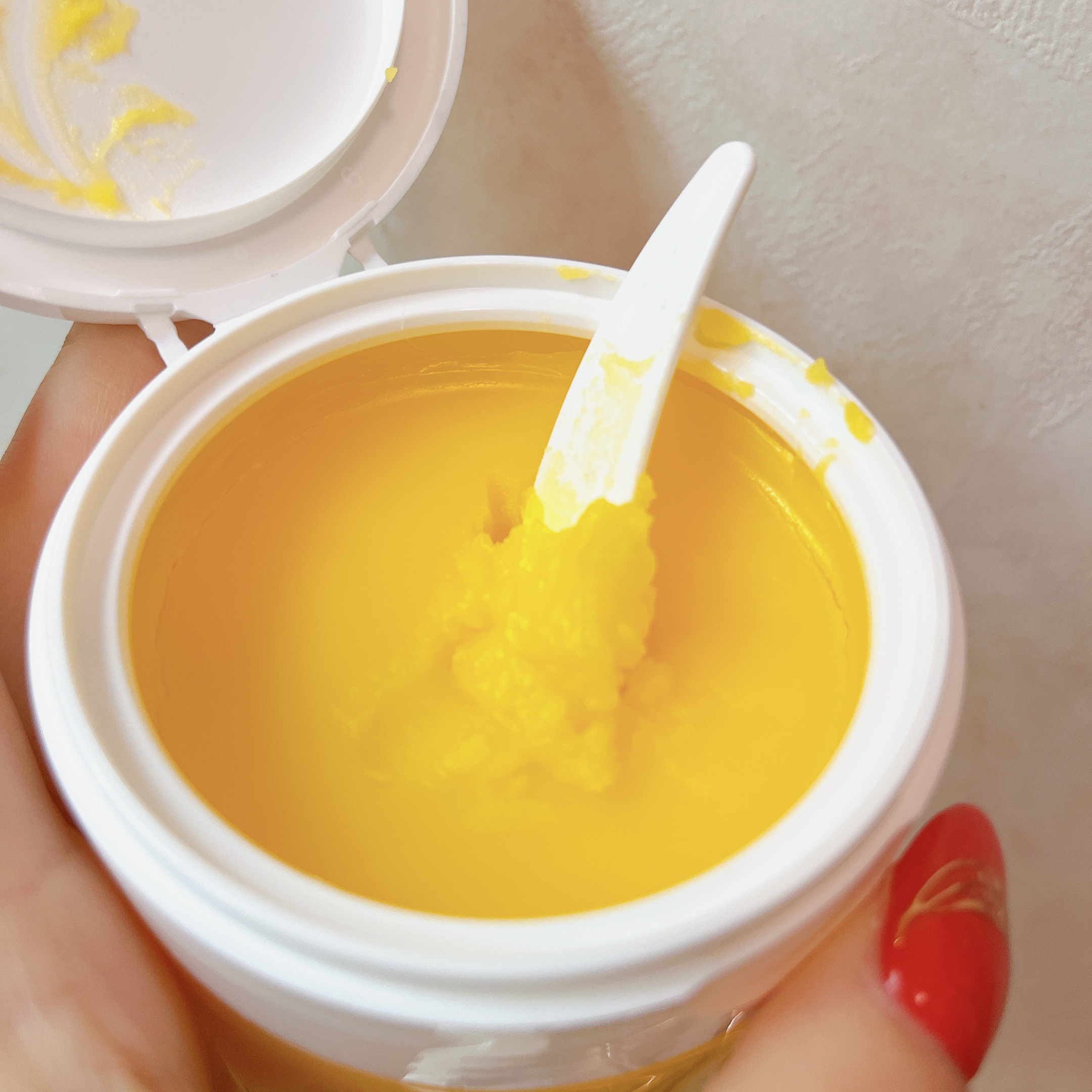- <95g> パルミチン酸エチルヘキシル、トリ(カプリル酸/カプリン酸)グリセリル、トリイソステアリン酸PEG-20グリセリル、合成ワックス、イソステアリン酸PEG-20グリセリル、水、アスコルビルグルコシド、パルミチン酸アスコルビルリン酸3Na、テトラヘキシルデカン酸アスコルビル、モロッコ溶岩クレイ、ベントナイト、プロテアーゼ、リパーゼ、セラミドNP、セラミドEOP、セラミドAP、ユズ果皮油、レモン果実エキス、マンダリンオレンジ果皮油、ビターオレンジ花油、グリチルリチン酸2K、トコフェロール、酢酸トコフェロール、アルガニアスピノサ核油、ダイズ油、シア脂、プラセンタエキス、水溶性コラーゲン、加水分解コラーゲン、ヒアルロン酸ヒドロキシプロピルトリモニウム、ビルベリー葉エキス、リンゴ果実エキス、ザクロ果実エキス、コメヌカエキス、カンゾウ根エキス、カミツレ花エキス、ウルチカジオイカエキス、ハマメリス葉エキス、乳酸桿菌/セイヨウナシ果汁発酵液、ゼニアオイ花エキス、スクワラン、ニンジン根エキス、ラウロイルラクチレートNa、BG、グリセリン、酢、温泉水、フィトスフィンゴシン、リン酸、カルボマー、キサンタンガム、フェノキシエタノール、マルトデキストリン、リン酸Na、スブチリシン、コレステロール、ペンチレングリコール、香料 <120g> パルミチン酸エチルヘキシル、トリ(カプリル酸/カプリン酸)グリセリル、トリイソステアリン酸PEG-20グリセリル、合成ワックス、イソステアリン酸PEG-20グリセリル、水、アスコルビルグルコシド、パルミチン酸アスコルビルリン酸3Na、テトラヘキシルデカン酸アスコルビル、モロッコ溶岩クレイ、ベントナイト、プロテアーゼ、リパーゼ、セラミドNP、セラミドEOP、セラミドAP、ユズ果皮油、レモン果実エキス、マンダリンオレンジ果皮油、ビターオレンジ花油、グリチルリチン酸2K、トコフェロール、酢酸トコフェロール、アルガニアスピノサ核油、ダイズ油、シア脂、プラセンタエキス、水溶性コラーゲン、加水分解コラーゲン、ヒアルロン酸ヒドロキシプロピルトリモニウム、ビルベリー葉エキス、リンゴ果実エキス、ザクロ果実エキス、コメヌカエキス、カンゾウ根エキス、カミツレ花エキス、ウルチカジオイカエキス、ハマメリス葉エキス、乳酸桿菌/セイヨウナシ果汁発酵液、ゼニアオイ花エキス、スクワラン、ニンジン根エキス、ラウロイルラクチレートNa、BG、グリセリン、酢、温泉水、フィトスフィンゴシン、リン酸、カルボマー、キサンタンガム、フェノキシエタノール、マルトデキストリン、リン酸Na、スブチリシン、コレステロール、ペンチレングリコール、香料