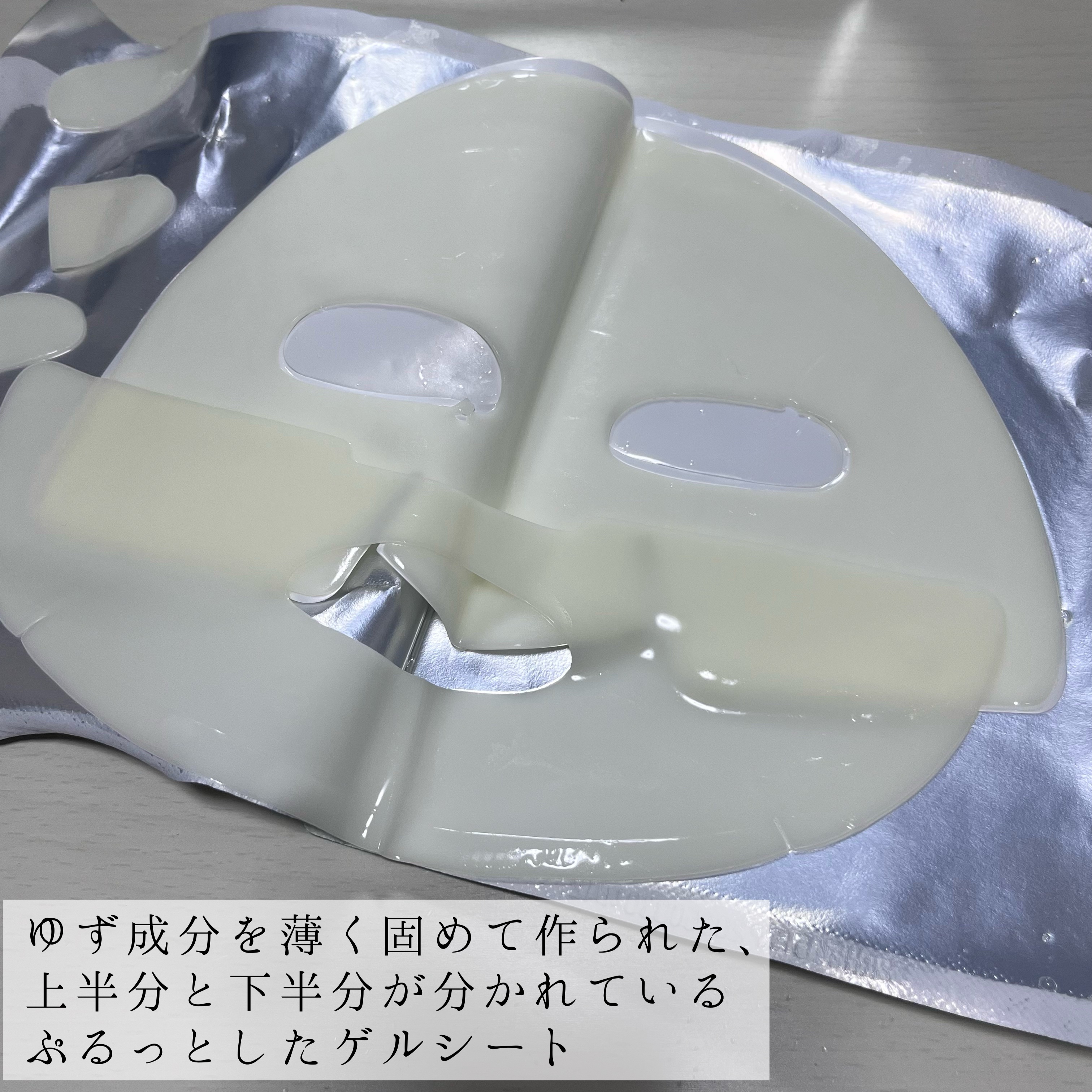 - エッセンスをたっぷり含んだゲル状マスク。 肌にしっかりと密着し、時間が経ってもしっとり感を保つことができます。 ゆずエキス配合で、豊富なビタミンCが透明感のある水光肌へと導きます。