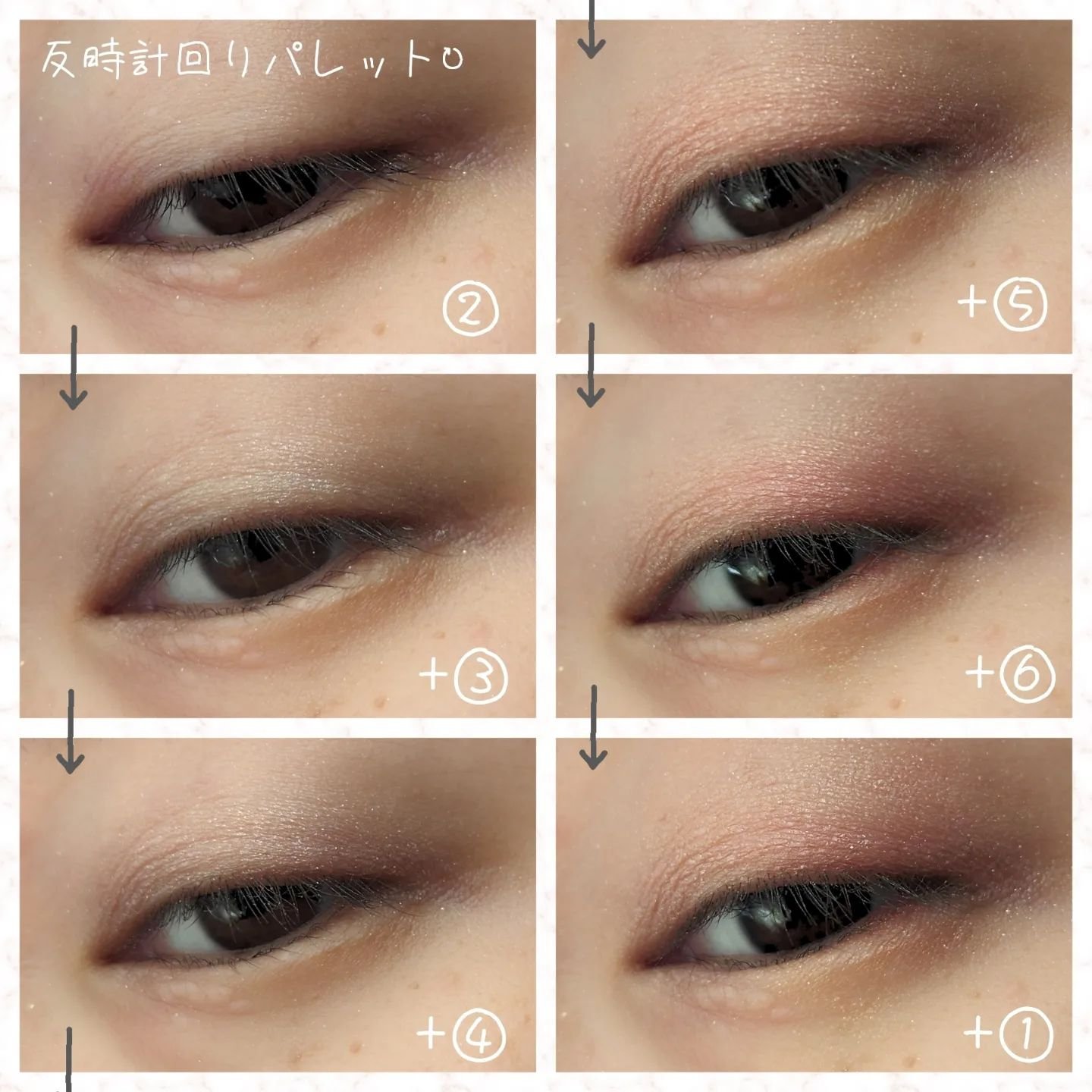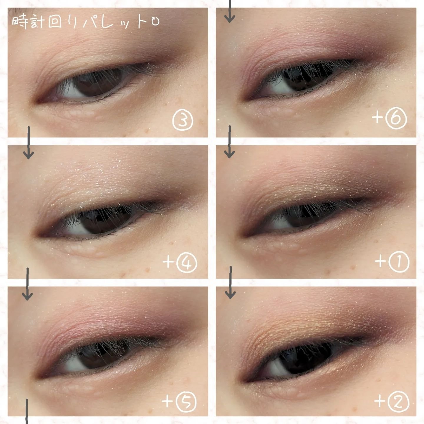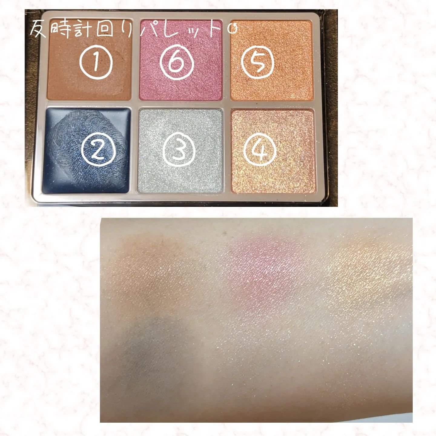 6色の中から、時計回り、反時計回りに4色を重ねるとおしゃれな目元になる!というパレットです。 重ねることで深みが増して、可愛い&ミステリアスな目元に仕上がる素敵なパレットです。 WHOMEEの商品は質感がデパコス級!粉の触り心地が良く、指で塗るのが楽しい♡
