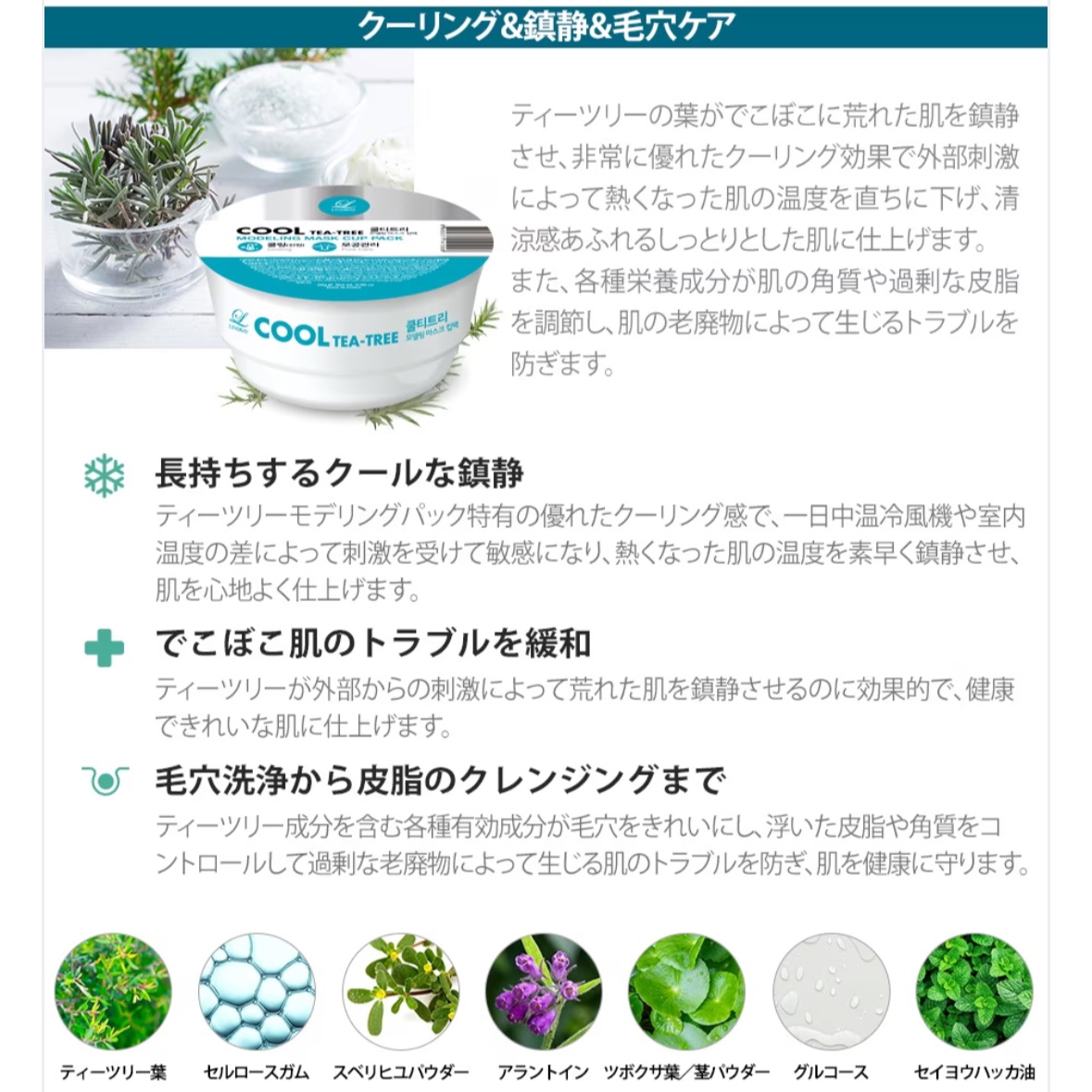 - ティーツリー葉のクーリング効果で肌を素早く整え、しっとりとしたみずみずしい肌に仕上げます。