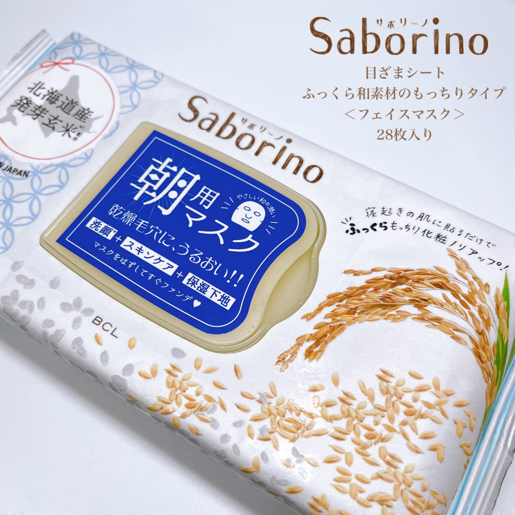 - 数量限定 「朝毛穴」をふっくらもっちり、お米マスクが誕生。 朝と夜で変わる肌悩みにしっかりアプローチ 寝起きに貼ってお米のマスクで朝からふっくら&もっちり肌に。 洗顔*1 からスキンケアをこれ1枚で 洗顔*1+ スキンケア + 保湿下地 ●厳選素材にこだわった北海道産発芽玄米*2使用 ●お米由来の保湿成分でふっくら 6種類米由来成分配合 コメ発酵液、米セラミド*3、コメヌカエキス フィチン酸、フェルラ酸、イノシトール ●和素材のパッケージを採用 通常のサボリーノに比べてプラスチック使用量15% 削減されています。 ●無着色、アルコールフリー、メントールフリー *1ふきとりによる *2 加水分解コメエキス *3 スフィンゴ糖脂質