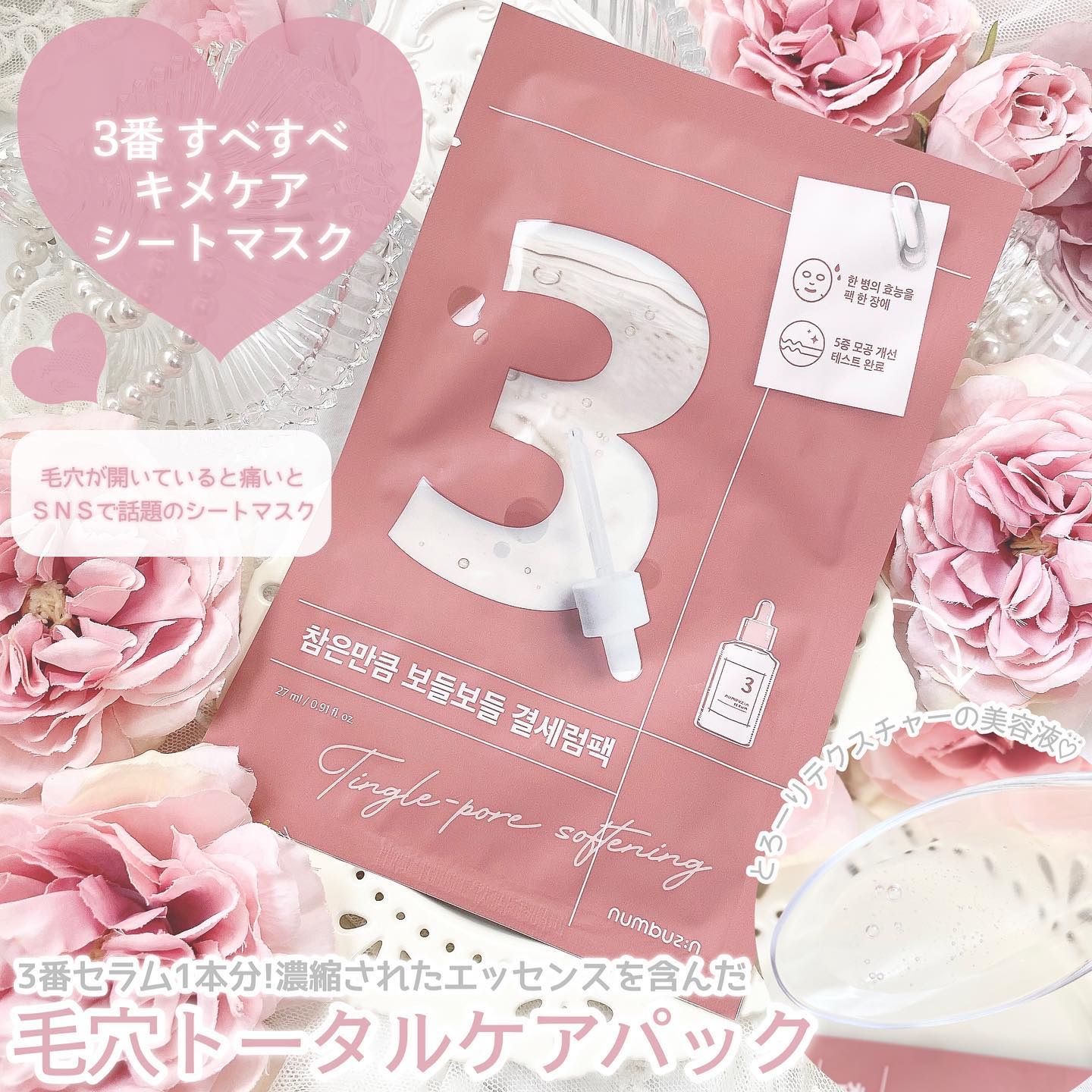 ...♡.ナンバーズインさまからいただきました。numbuzin3番すべすべキメケアシートマスク4枚入りセラムのガラクトミセスとビフィズス菌の発酵シナジー成分をギュッと濃縮!発酵成分と毛穴収れん成分を配合し、たった1回使うだけで、肌のキメの変...