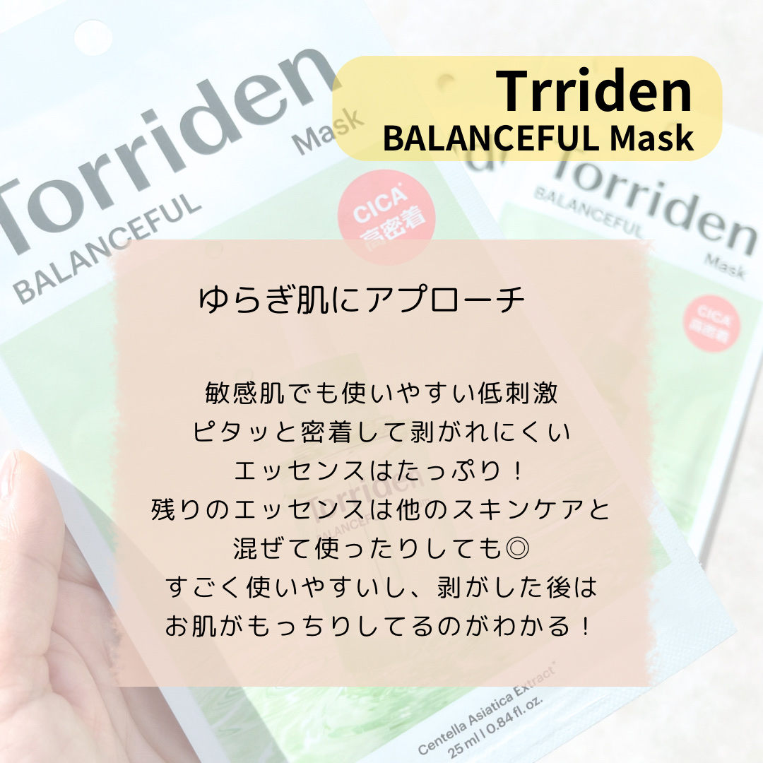 Torridenバランスフルシカマスク肌あれ予防やゆらぎ肌を集中ケア✨毛穴悩みが気になるときにも❗️薄めのシートに美容液がたっぷりと含まれていて袋から出したときはポタポタたれてきます!!シートの肌触りも良くピタっと肌に密着してくれます😊このタ...