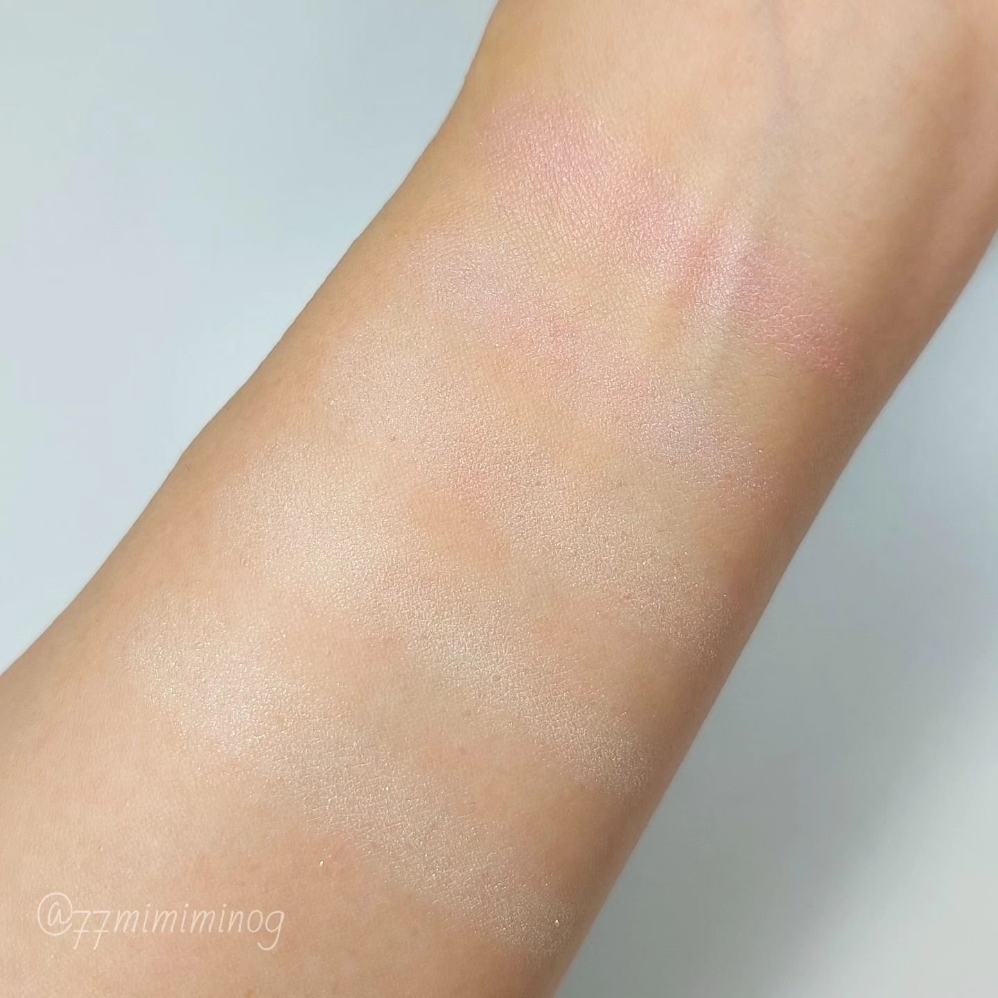 RMKのアイシャドウはこれがデビュー。こんなんブルベホイホイじゃん…。かわいすぎて即予約電話したわ🫠🩷 青みピンクに透明感爆発パープルにキラキララメ。締め色はグレージュっぽいブラウン。ブルベ大歓喜。 発色は調整しやすい。ピンクも見た目はビビッドだけど、ふんわり色づくので、好みの濃さにできるよ。