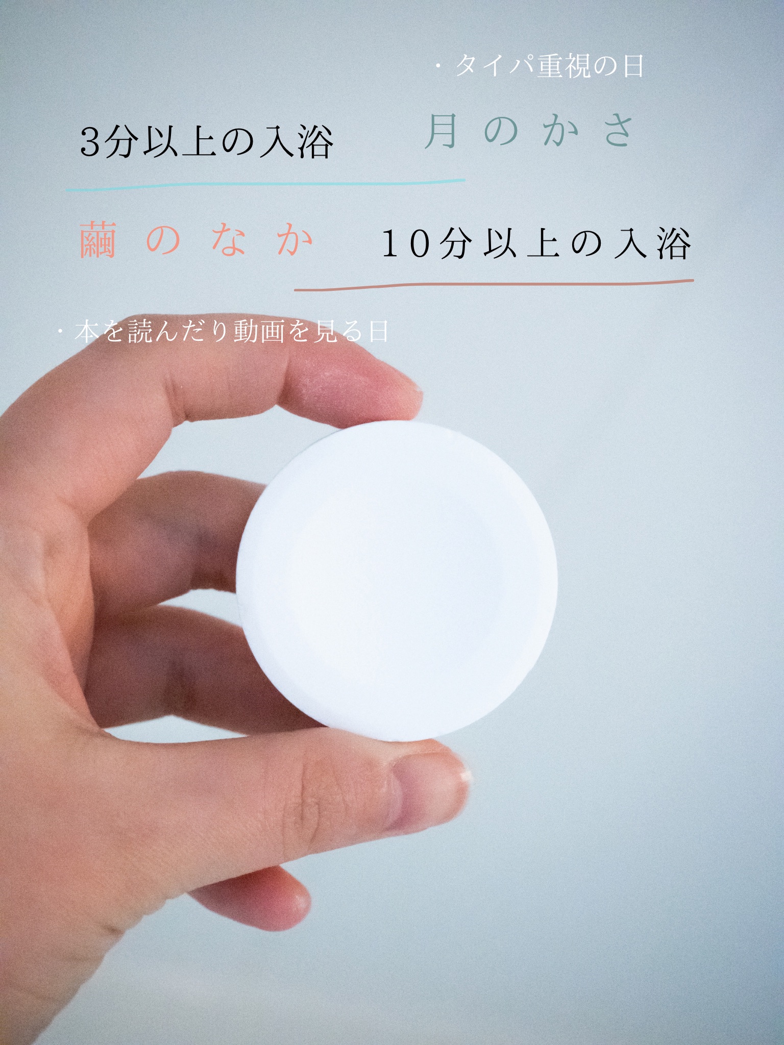 - 【医薬部外品】 その日の気分と時間で選ぶ2つの香り付き重炭酸*1タイプの入浴剤。 繭のなか&月のかさ 日によっての入浴時間で使い分けたい方へ。 繭のなか(溶解時間約10分*2)深呼吸したくなるヴァイオレット&ハーブの香り。 月のかさ(溶解時間約3分*2)解放感のあるネロリ&ライラックの香り。 *1 炭酸水素Na *2 150~200Lのお湯(38~40度程度)に溶かした場合のおおよその溶解時間。ご利用環境により、溶解時間は前後する場合がございます。