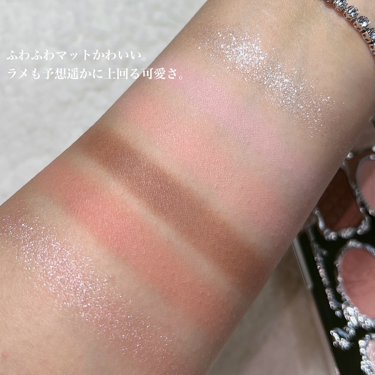 よくパレットのなかで明るいカラーをベースにまぶたに広く塗ることが多いのですが、パール感のあるカラーを避ける🙆♀️! パール感たっぷりの明るいカラーは涙袋に使うぐらい光を集めてぷっくり見せてくれるので、まぶたに広く使うと腫れぼったく見えがち😓 目元を明るくみせてくれたり、次に使うアイシャドウをぼかしやすくしてくれるけど、すっ飛ばしてメインのカラーを塗っちゃう✊🏻❤️🔥 涙袋にはたっぷり塗ってぷっくり見せる🙆♀️💕 シルキースフレアイズのマットタイプはすごく優れているな〜と感じました☺️💗 赤やオレンジなどは、入れすぎると腫れぼったく見えやすいので、見せたいカラーは下まぶた目尻にのせて色をたのしむ♡♡ パール感なしの透けマットだけじゃ物足りない… そう感じさせない華やかなラメが左上に入っているので黒目上と涙袋にのせるとすごく可愛い仕上がりに😍! 厄介な左右差のお陰でマットアイシャドウが好きになりました😌💕