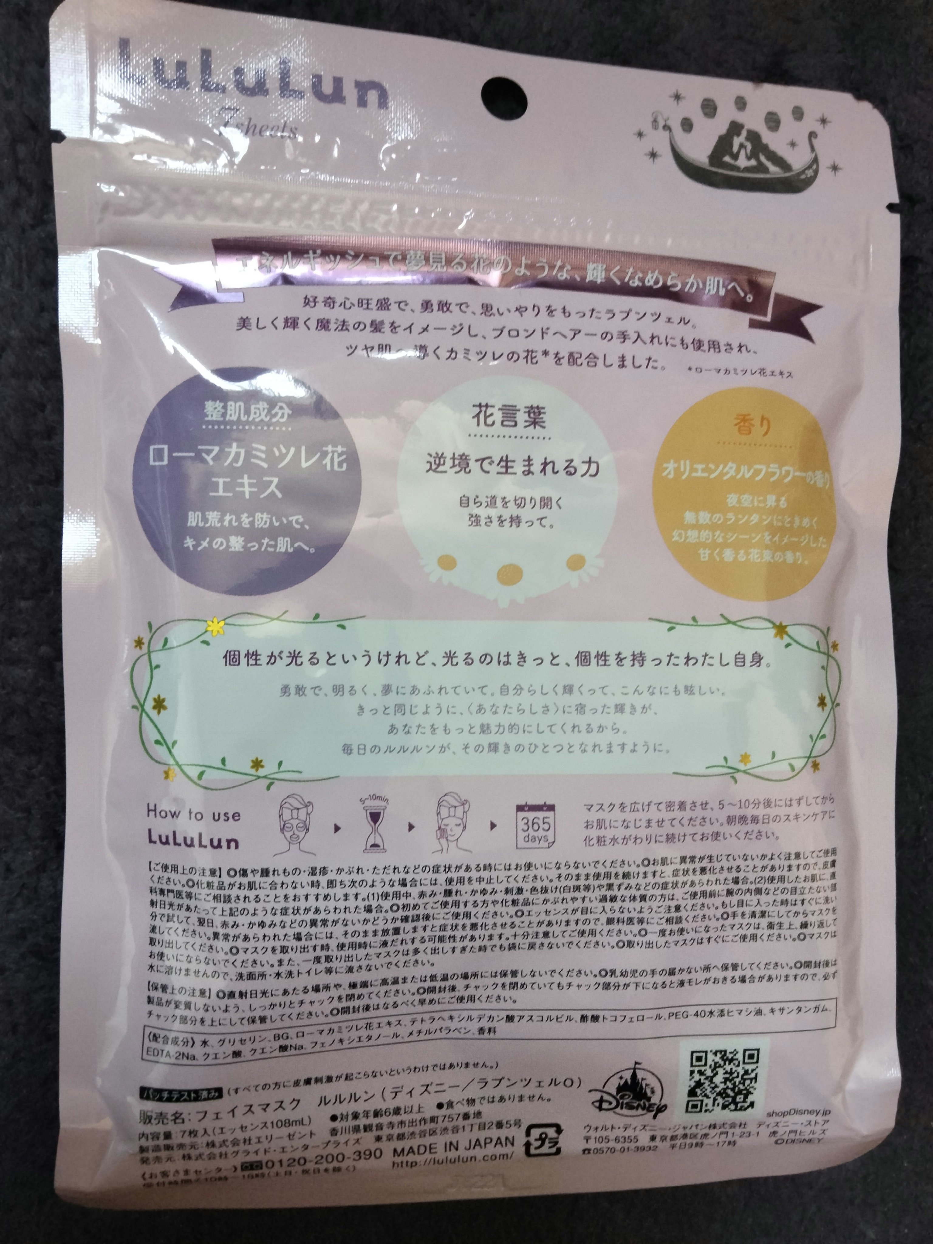 美しく輝く魔法の髪をイメージし、ブロンドヘアーの手入れにも使用され、 ツヤ肌へ導くカミツレの花を配合。 エネルギッシュで夢見る花のような、輝くなめらか肌へ。 好奇心旺盛で、勇敢で、思いやりをもったディズニープリンセス "ラプンツェル"からインスピレーションを受けたフェイスマスク💐 ラプンツェルをイメージした2種類のフェイスマスクセット。 整肌成分:ローマカミツレ花エキス 花言葉 :「逆境で生まれる力」 パスカルと過ごすラプンツェルの日常と光を夢見る心を表現したプリティーブーケの香りは、可憐で軽やかな花束の香り。 夜空に昇るランタンの幻想的なシーンをイメージしたオリエンタルフラワーの香りは、甘く香る花束の香り。